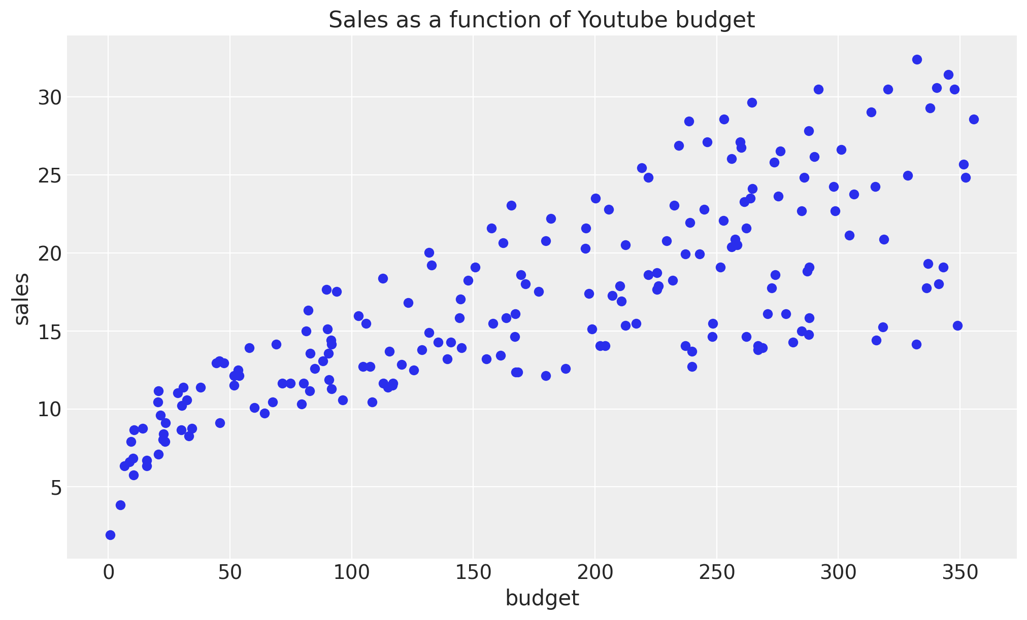 ax.set(title="Sales as a function of Youtube budget", xlabel="budget", ylabel="sales");