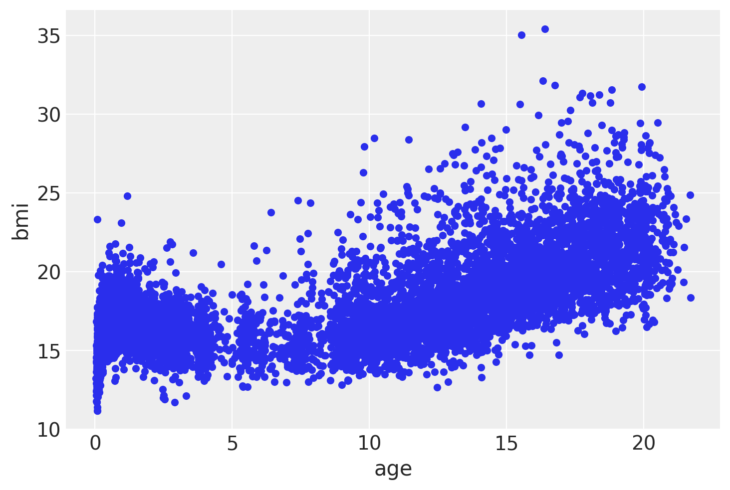 As we can see from the previous figure the relationship between BMI and age is far from linear, and hence we are going to use BART.