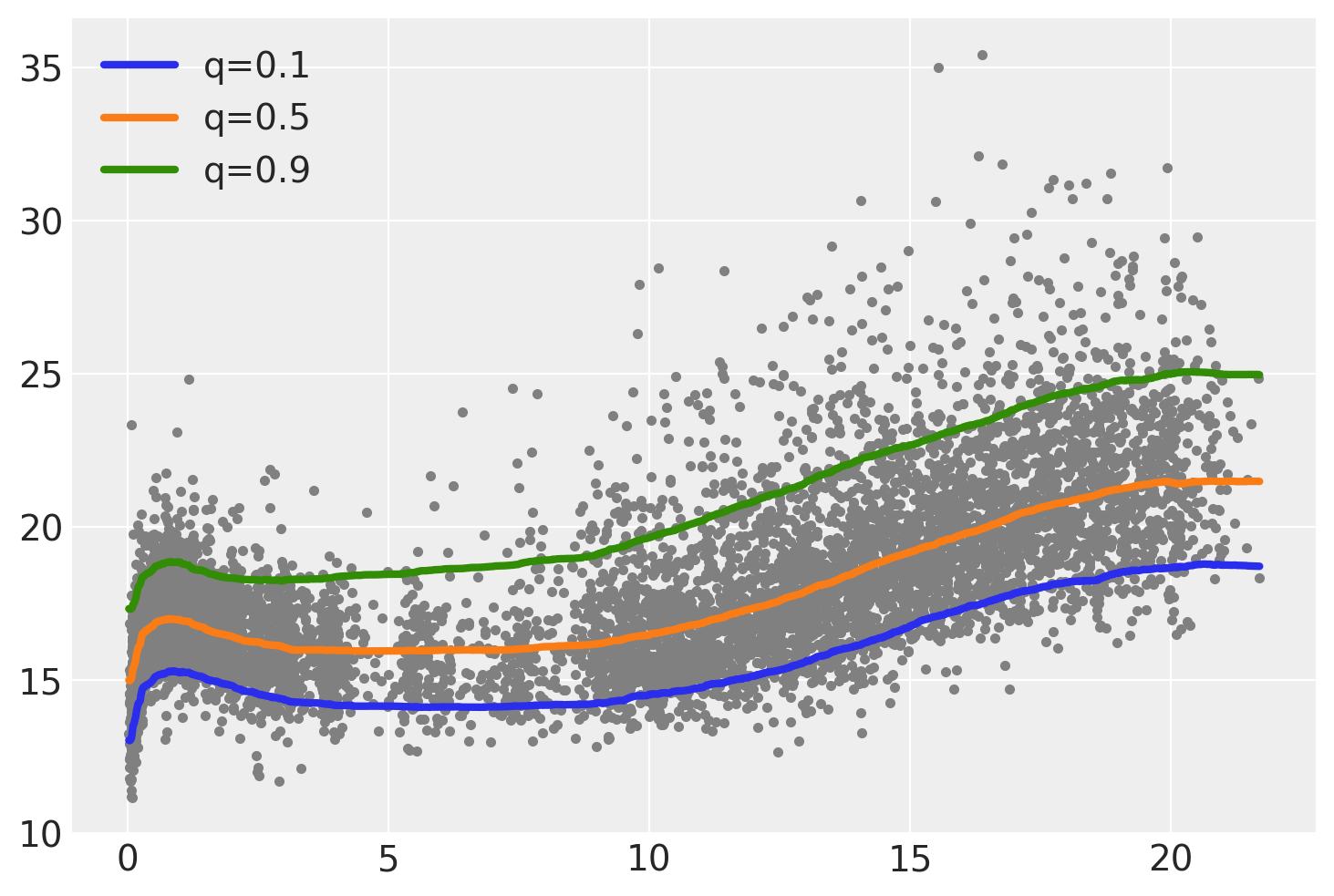 We are going to model 3 quantiles, 0.1, 0.5 and 0.9. We can compute this quantity by fitted 3 separated model, being the sole different the value of q of the Asymmetric Laplace distribution. Or we can stack the observed values as in y_stack and fit a single model.