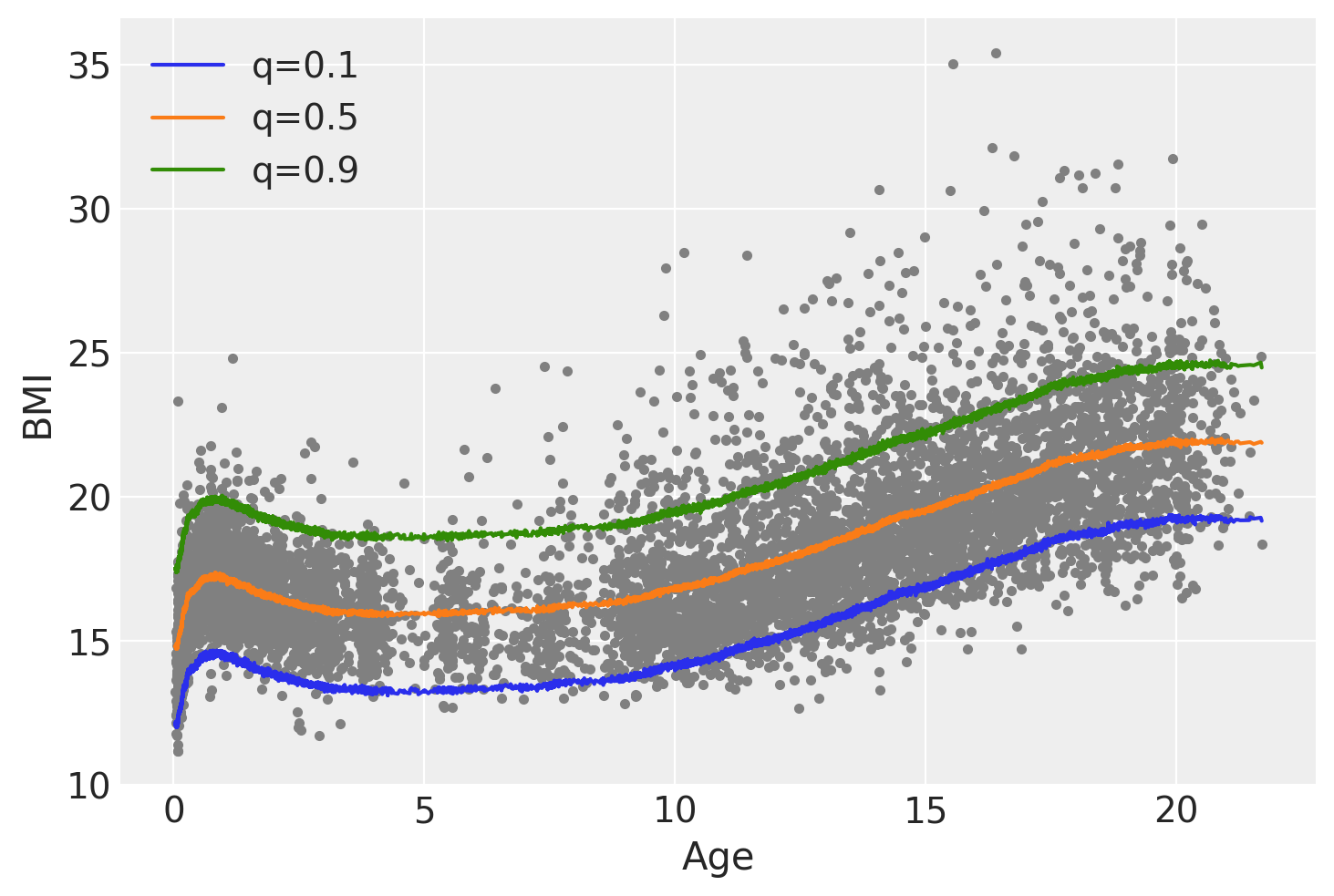 We can see that when we use a Normal likelihood, and from that fit we compute the quantiles, the quantiles q=0.1 and q=0.9 are symmetrical with respect to q=0.5, also the shape of the curves is essentially the same just shifted up or down. Additionally the Asymmetric Laplace family allows the model to account for the increased variability in BMI as the age increases, while for the Gaussian family that variability always stays the same.