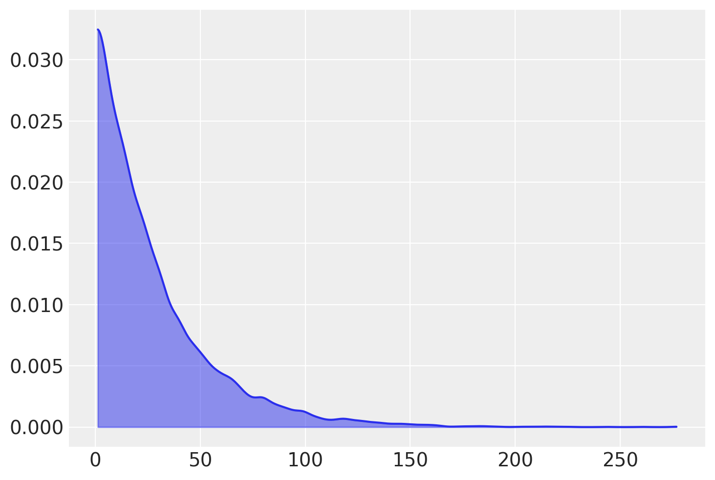 az.plot_kde(rng.exponential(scale=29, size=10000) + 1, fill_kwargs={"alpha": 0.5});
