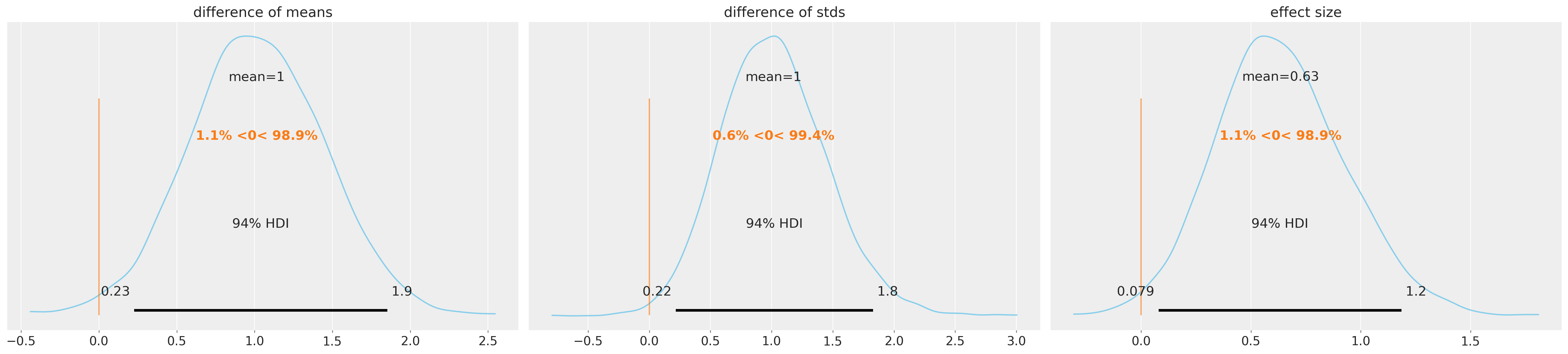var_names=["difference of means", "difference of stds", "effect size"],