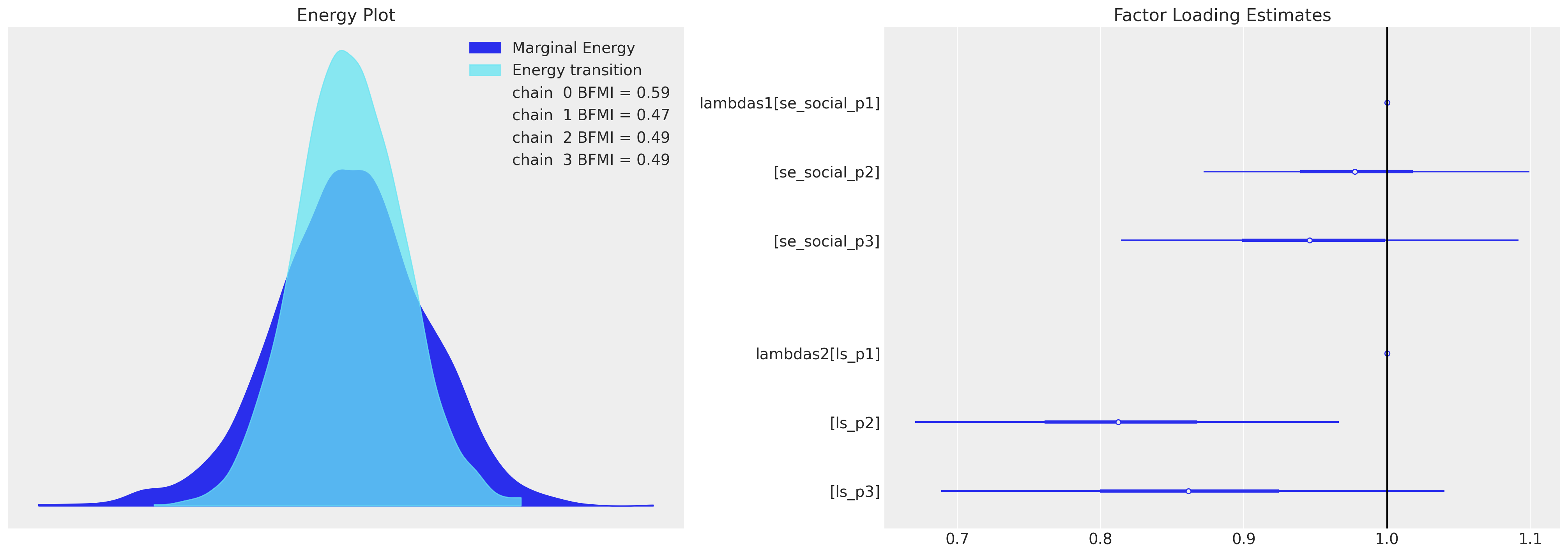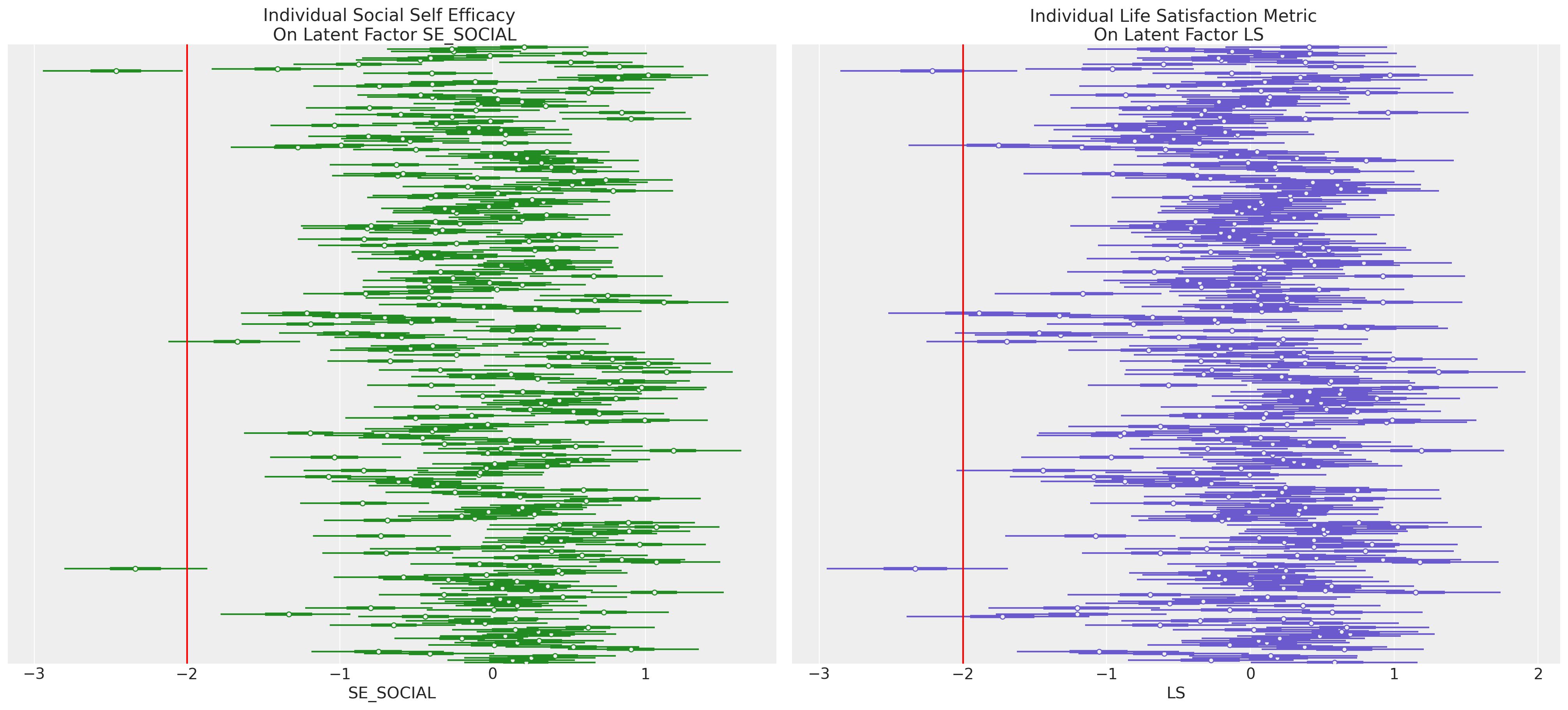 We’ll start by fitting a “simple” CFA model in PyMC to demonstrate how the pieces fit together, we’ll then expand our focus. Here we ignore the majority of our indicator variables and focus on the idea that there are two latent constructs: (1) Social Self-efficacy and (2) Life Satisfaction.