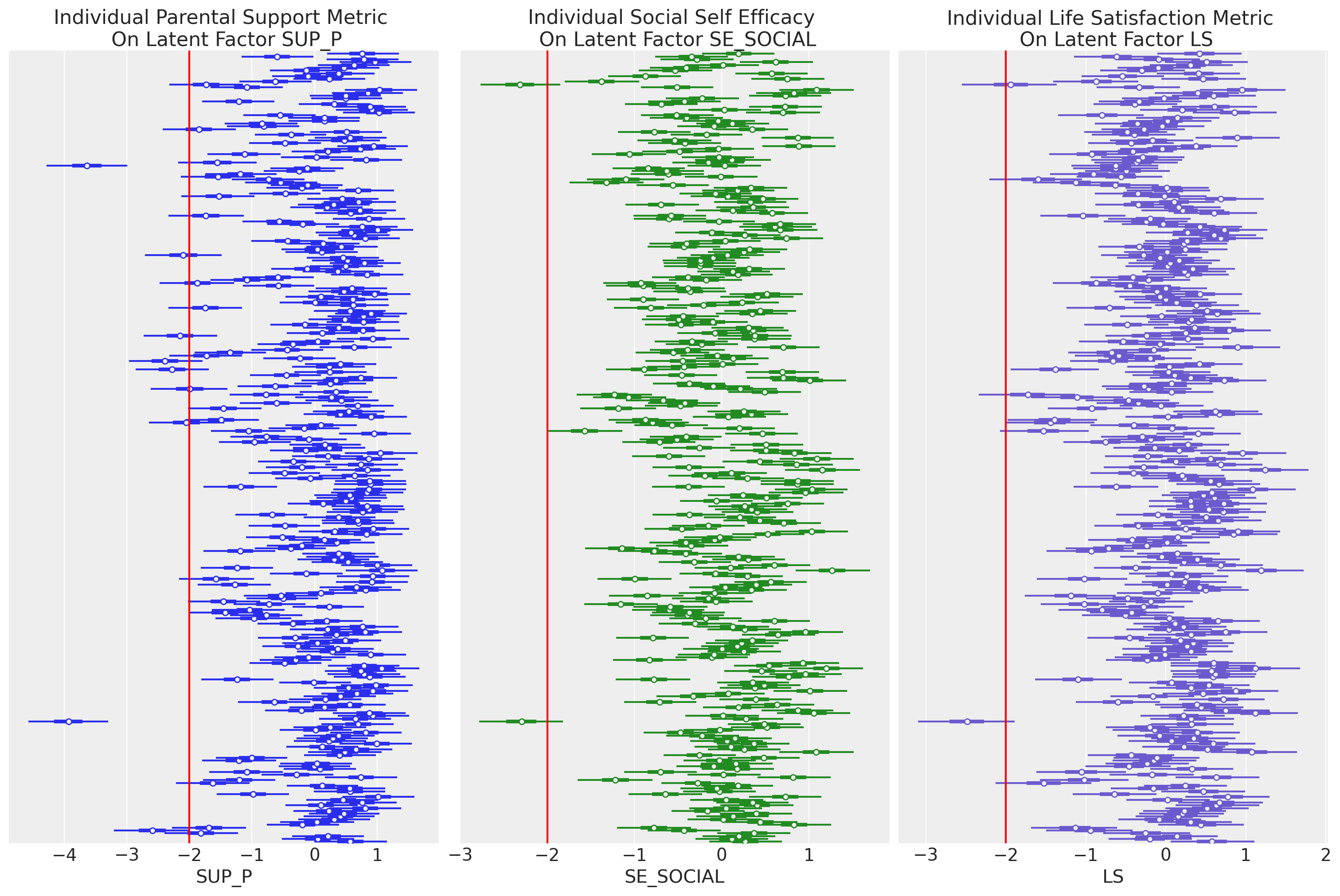 We have survey responses from ~300 individuals who have answered questions regarding their upbringing, self-efficacy and reported life-satisfaction. The hypothetical dependency structure in this life-satisfaction dataset posits a moderated relationship between scores related to life-satisfaction, parental and family support and self-efficacy. It is not a trivial task to be able to design a survey that can elicit answers plausibly mapped to each of these “factors” or themes, never mind finding a model of their relationship that can inform us as to the relative of impact of each on life-satisfaction outcomes.