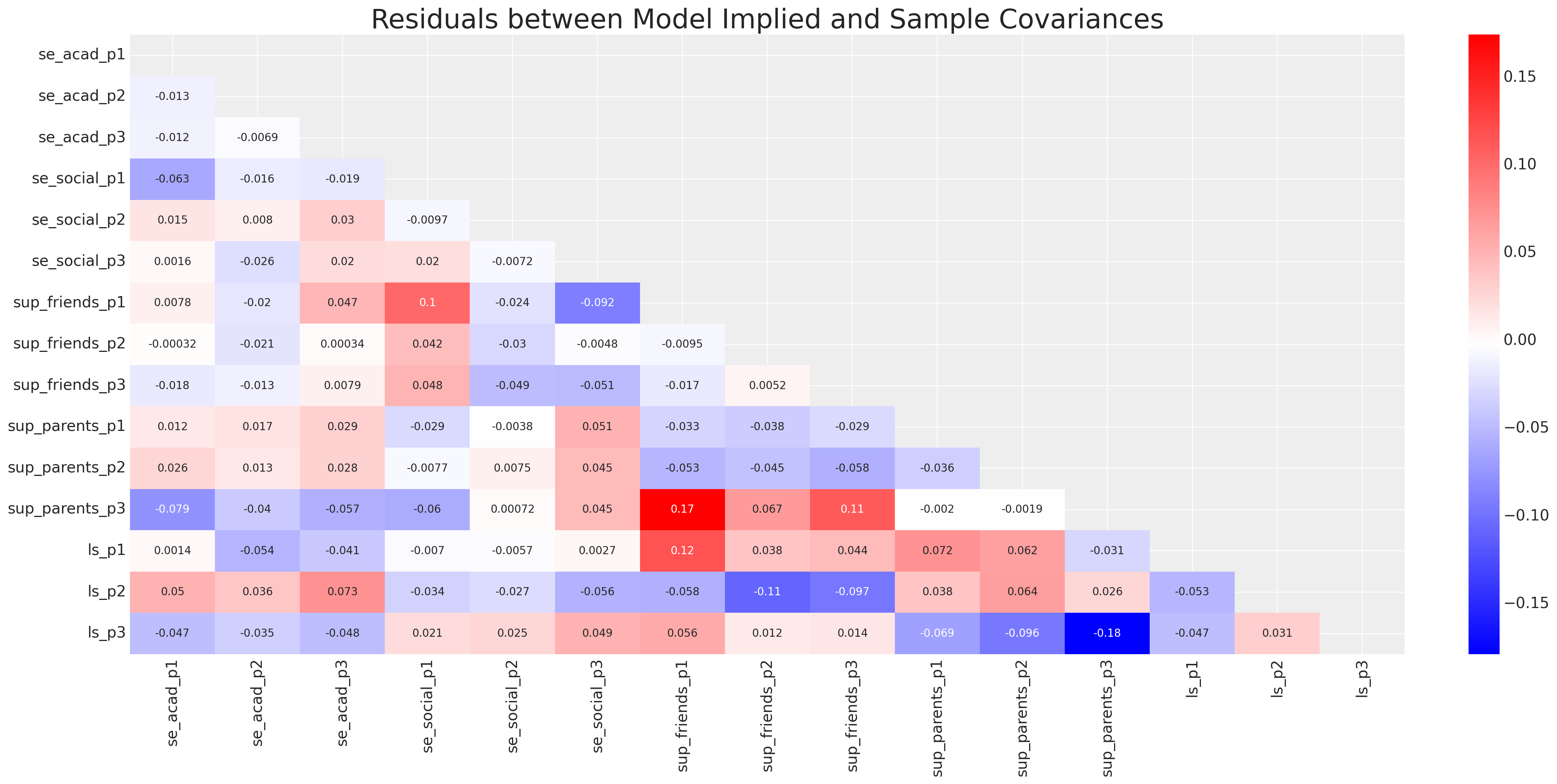 Similar diagnostic results hold for the other models. We now continue to assess questions of direct and indirect effects that were obscure in the simpler measurement model. By which I mean we trace out the total paths that influence life-satisfaction and assess the relative strength of impact due to parental and peer support.