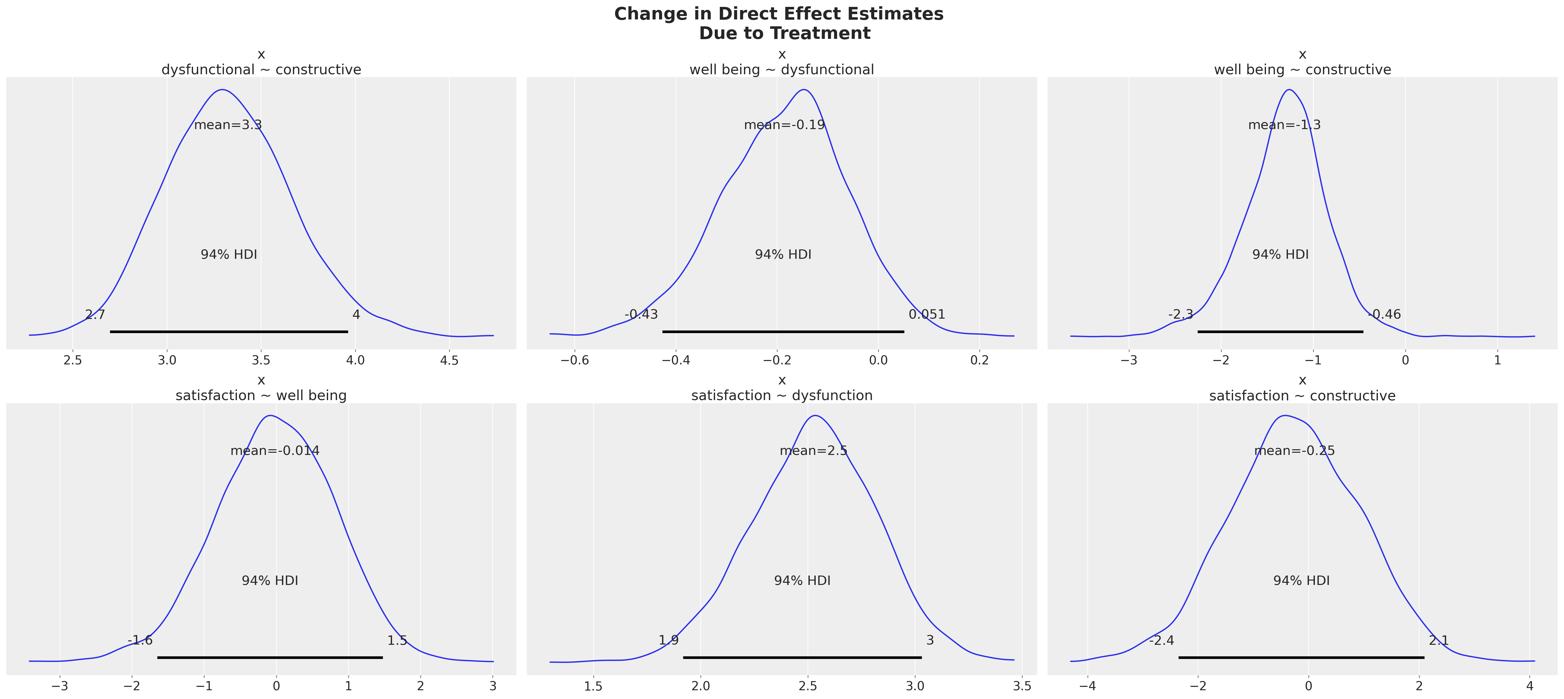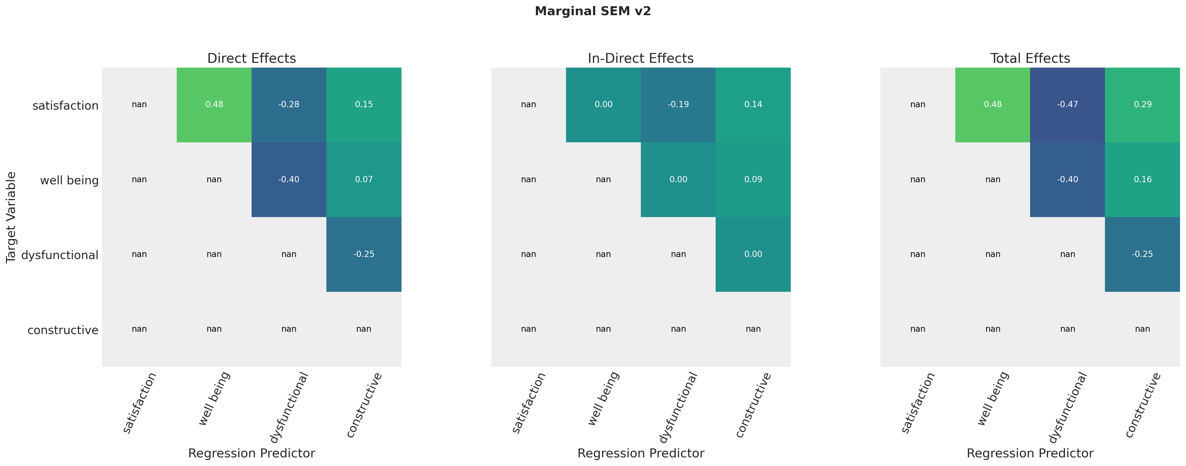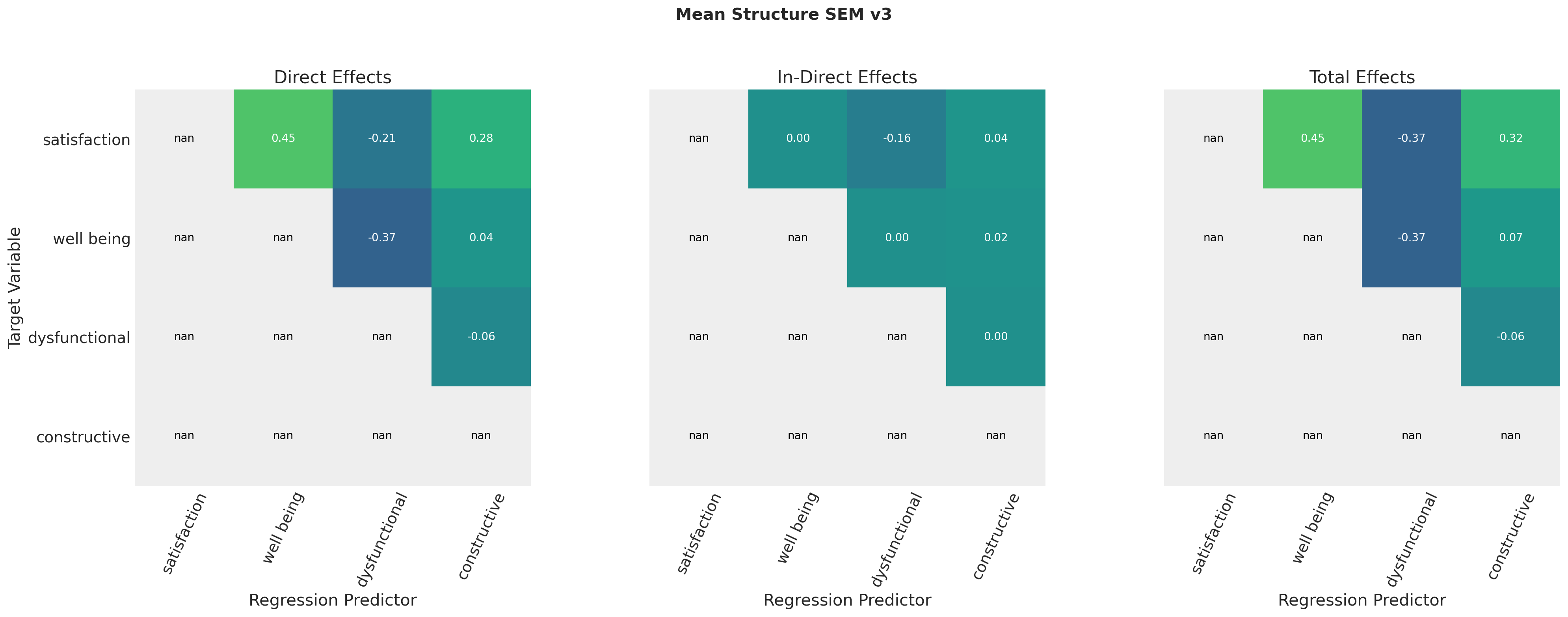 In the structural model we specify how we believe the latent constructs relate to one another. The term \((I - B)^{-1}\) is sometimes called the total effects matrix because it can be expanded as \(I + B + B^{2} + B^{3}...\) summing all possible chains of paths in the system. As we’ll see the structural and mediating paths between these latent constructs can be additive. This observation allows us to very elegantly derive total, indirect and direct effects within the system.
