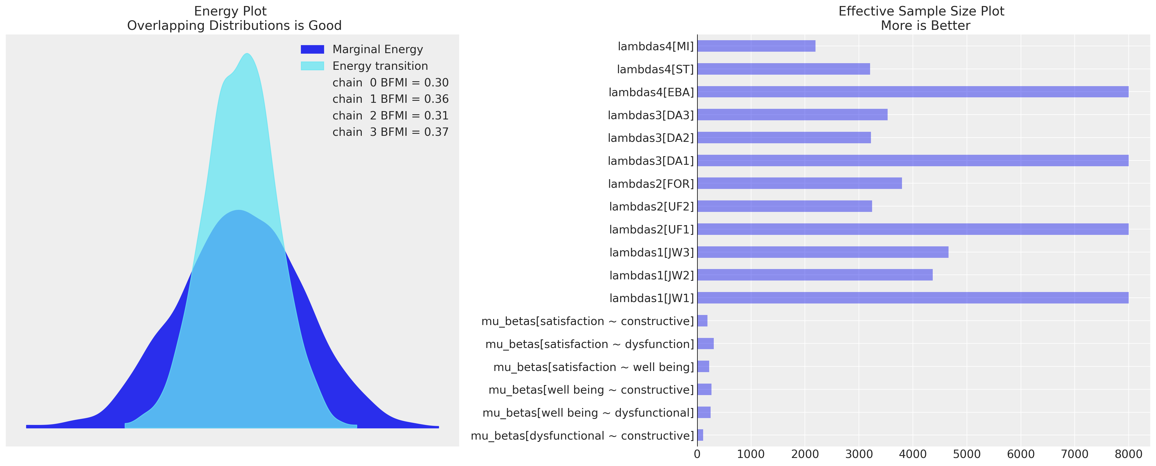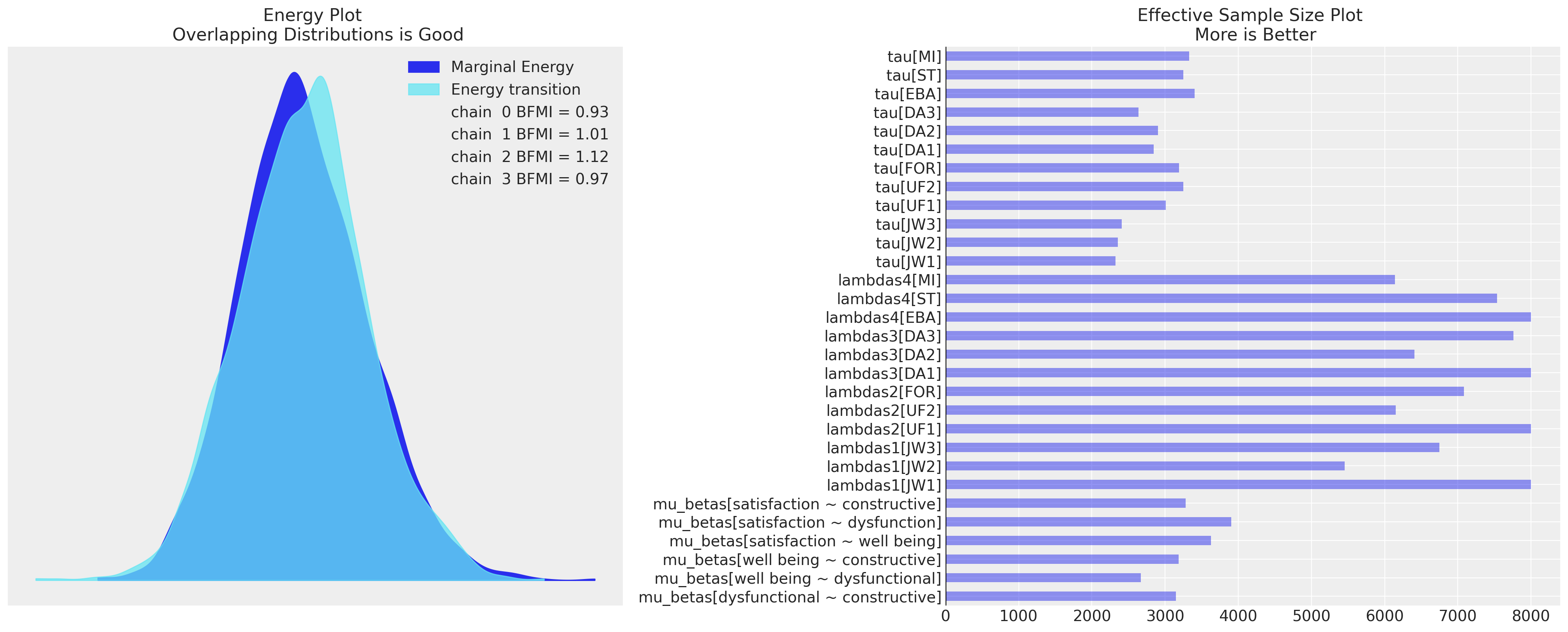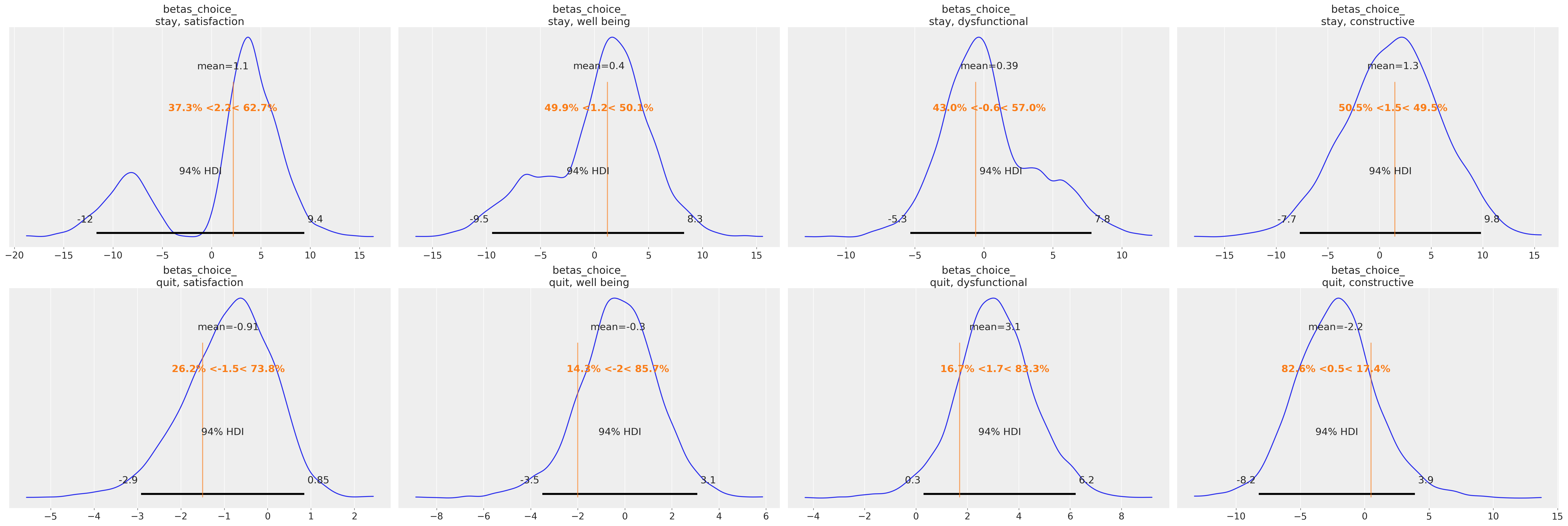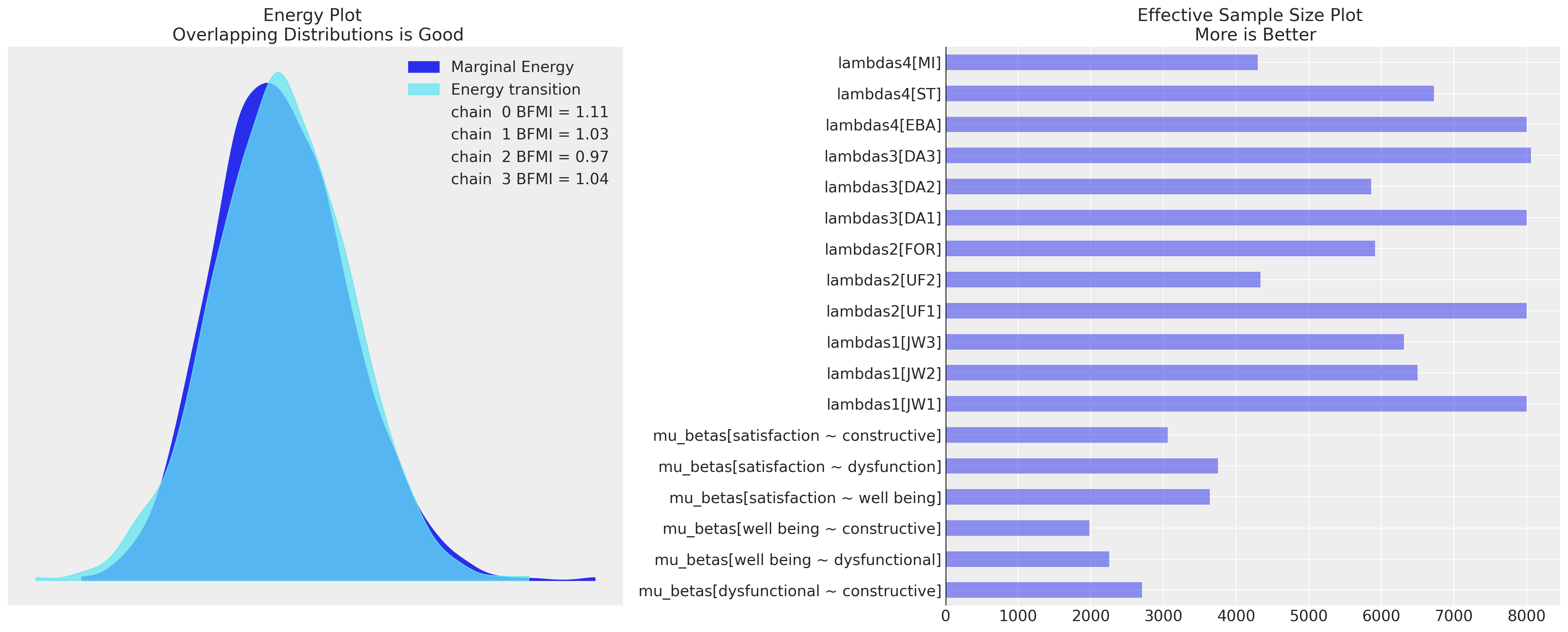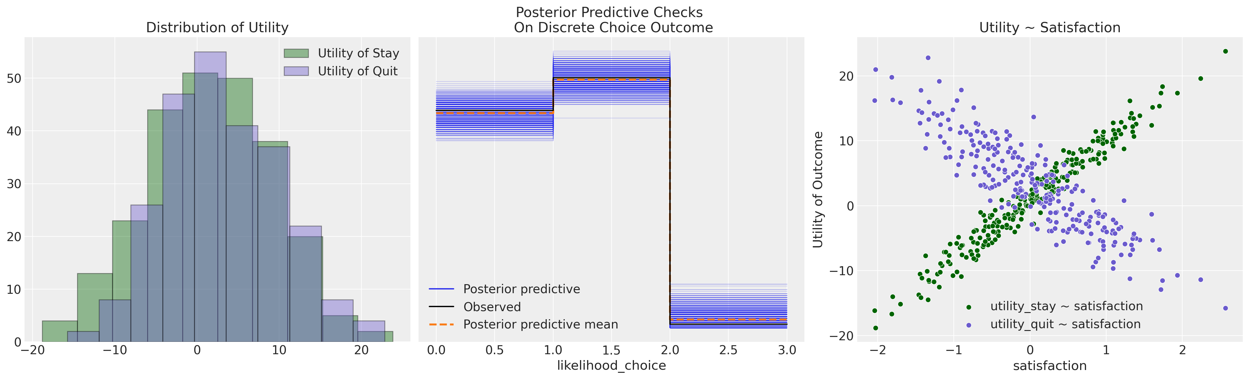 We can recover the inverse relationship we encoded in the outcomes between job-satisfaction and the choice to stay. Similarly, this posterior predictive checks look sound. This is encouraging.