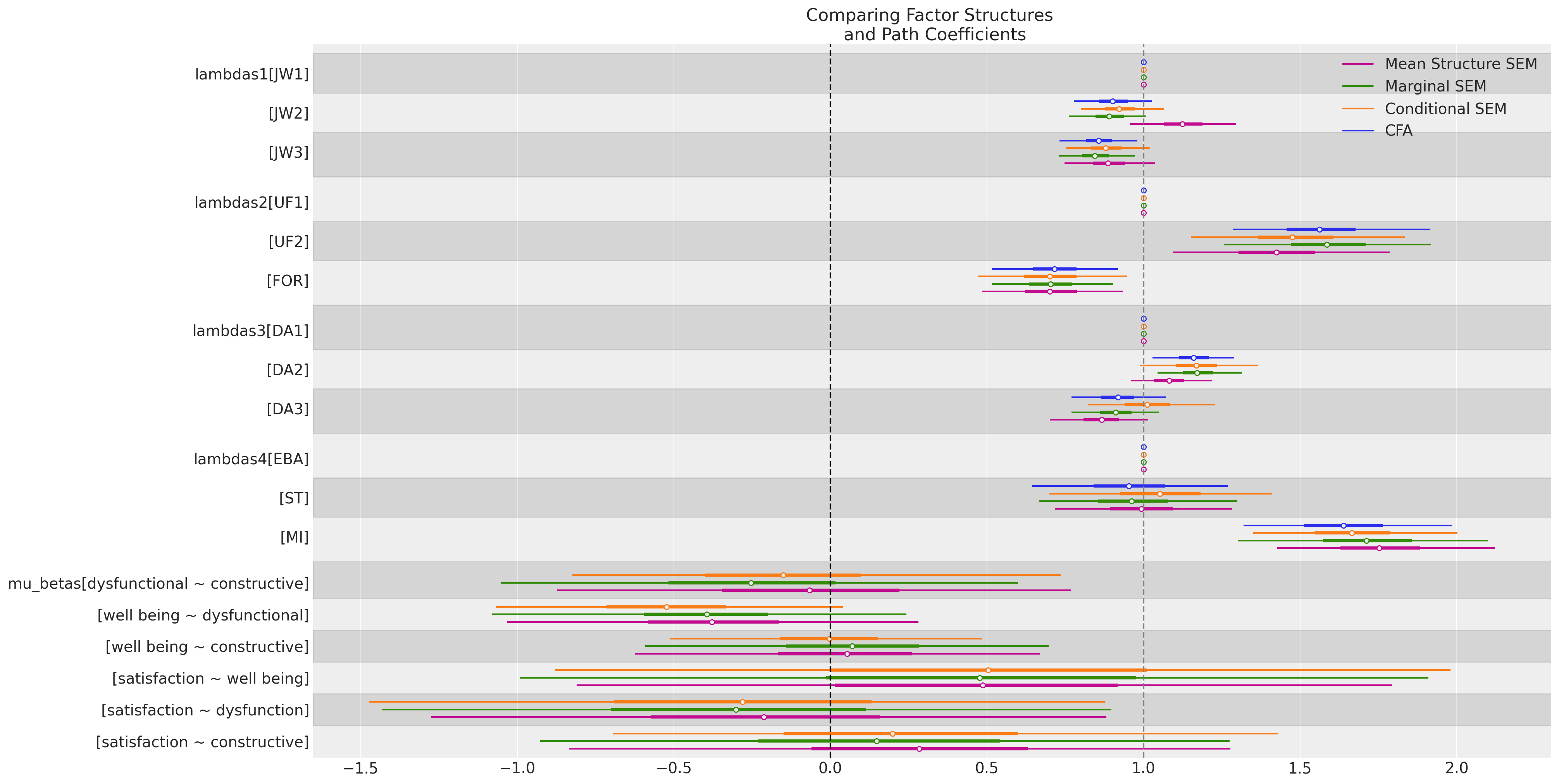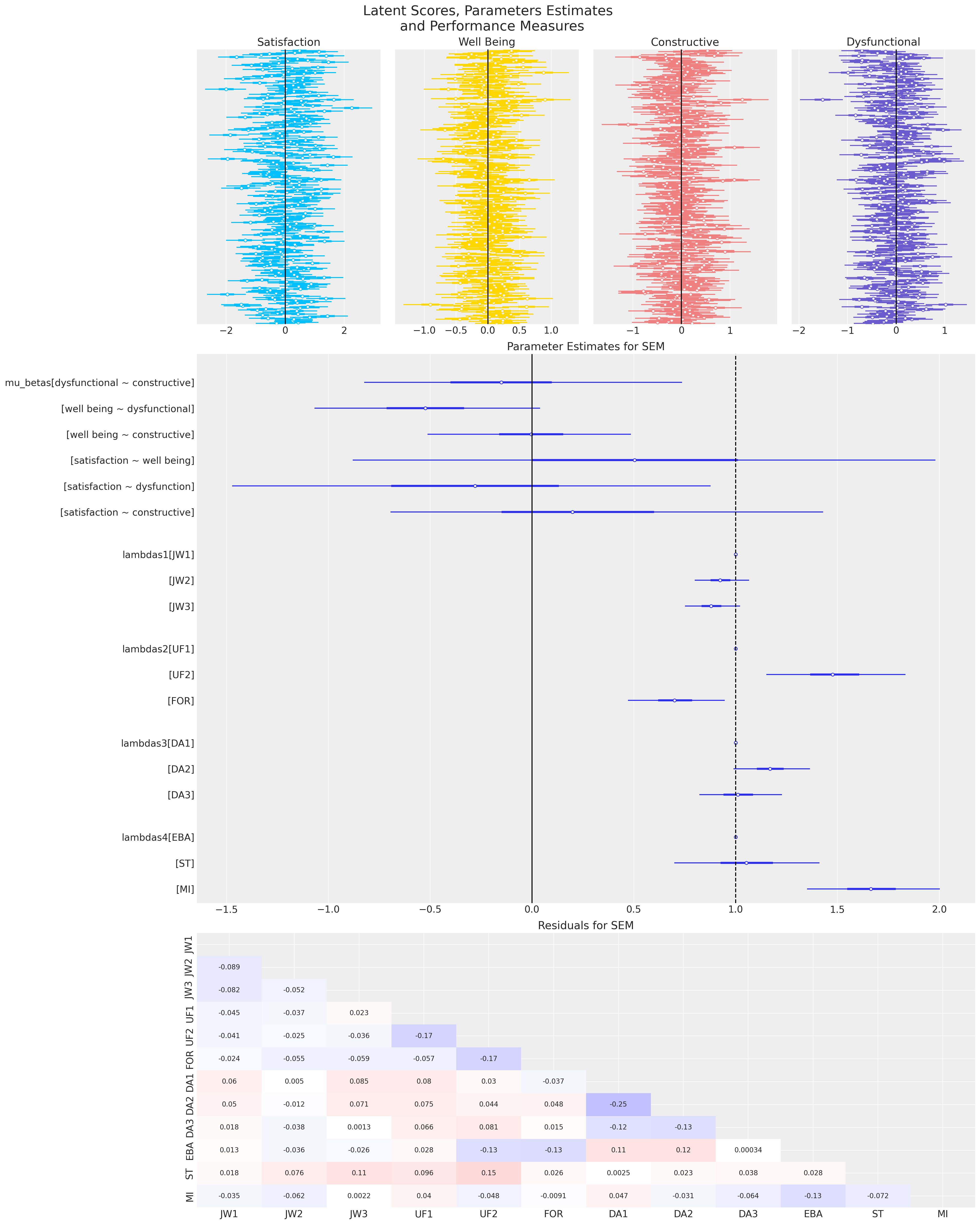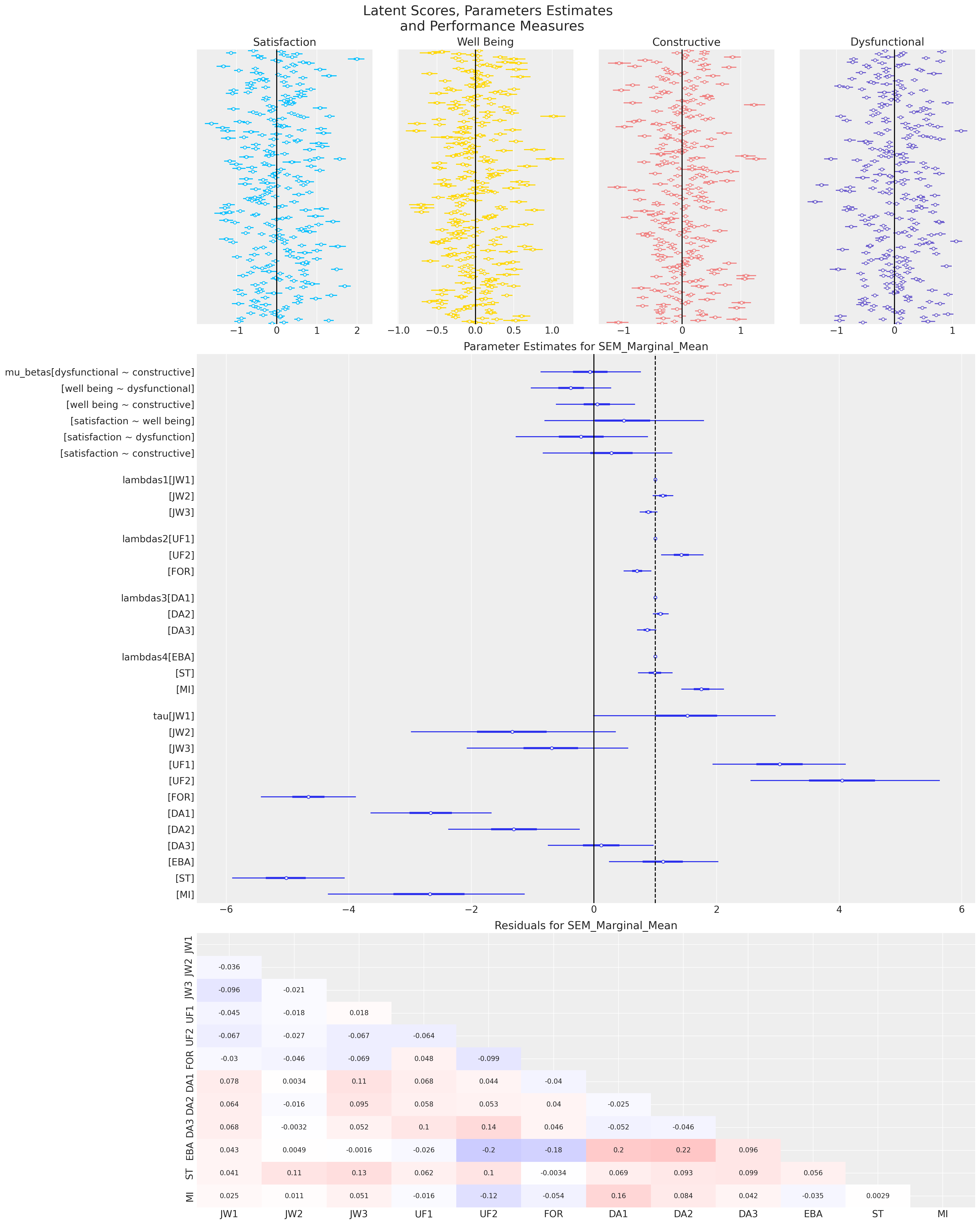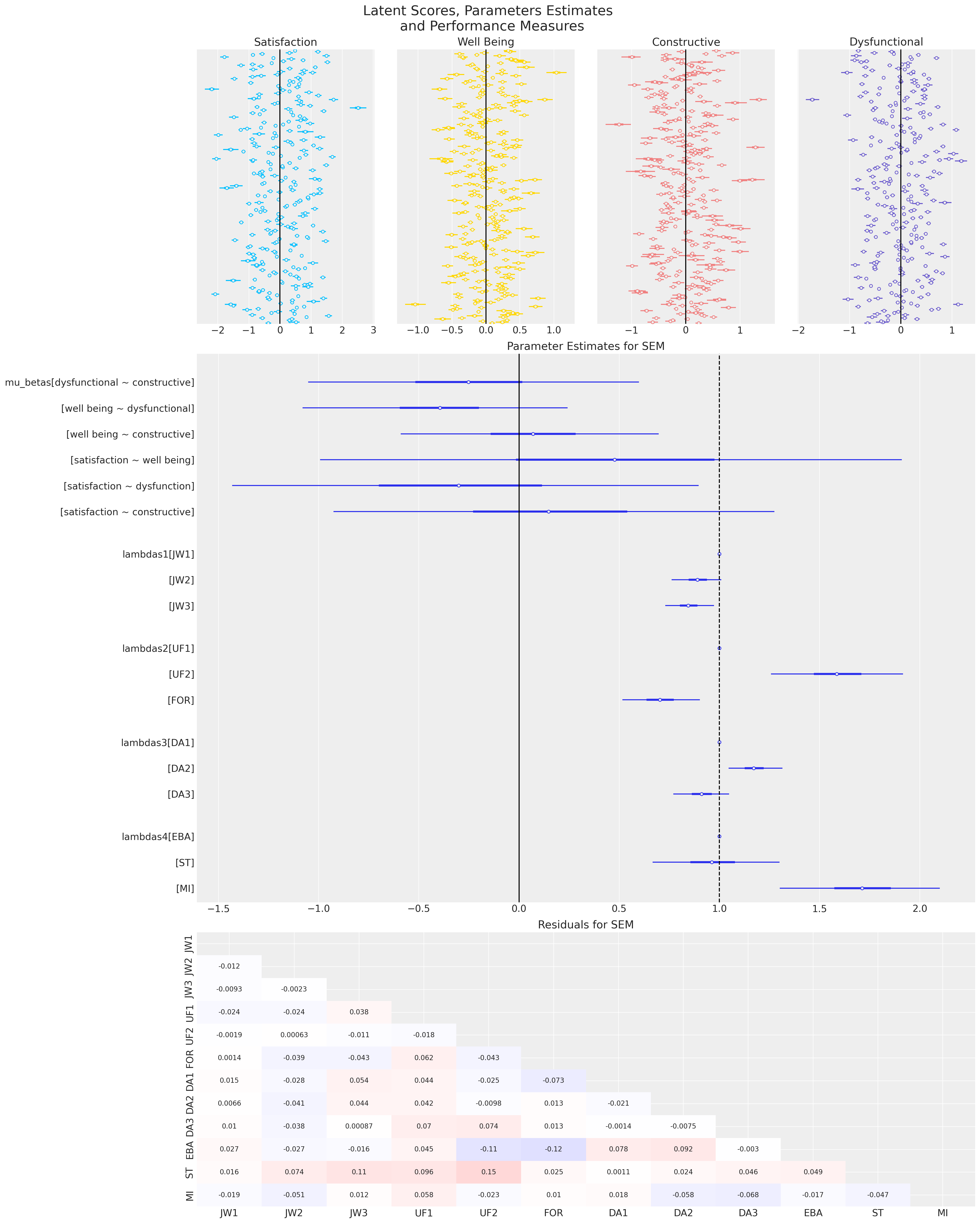 We have now seen how to articulate Structural Equation models and their variants in PyMC. The SEM workflow is, at heart, Bayesian in temperament. Hypothesise and construct. Construct then Estimate. Estimate and check. Check then refine. Refine then expand… Both disciplines reject the checklist mentality of “fit once, report, move on.” Instead, they cultivate a focused, deliberate practice. Each demands an apprenticeship in which skill is honed: skill to see how assumptions shape understanding, and how the world resists the imposition of false structures. Skill to find the right structures. Each iteration is a dialogue between theory and evidence. At each juncture we ask whether this model speaks true? Whether this structure reflects the facts to hand?