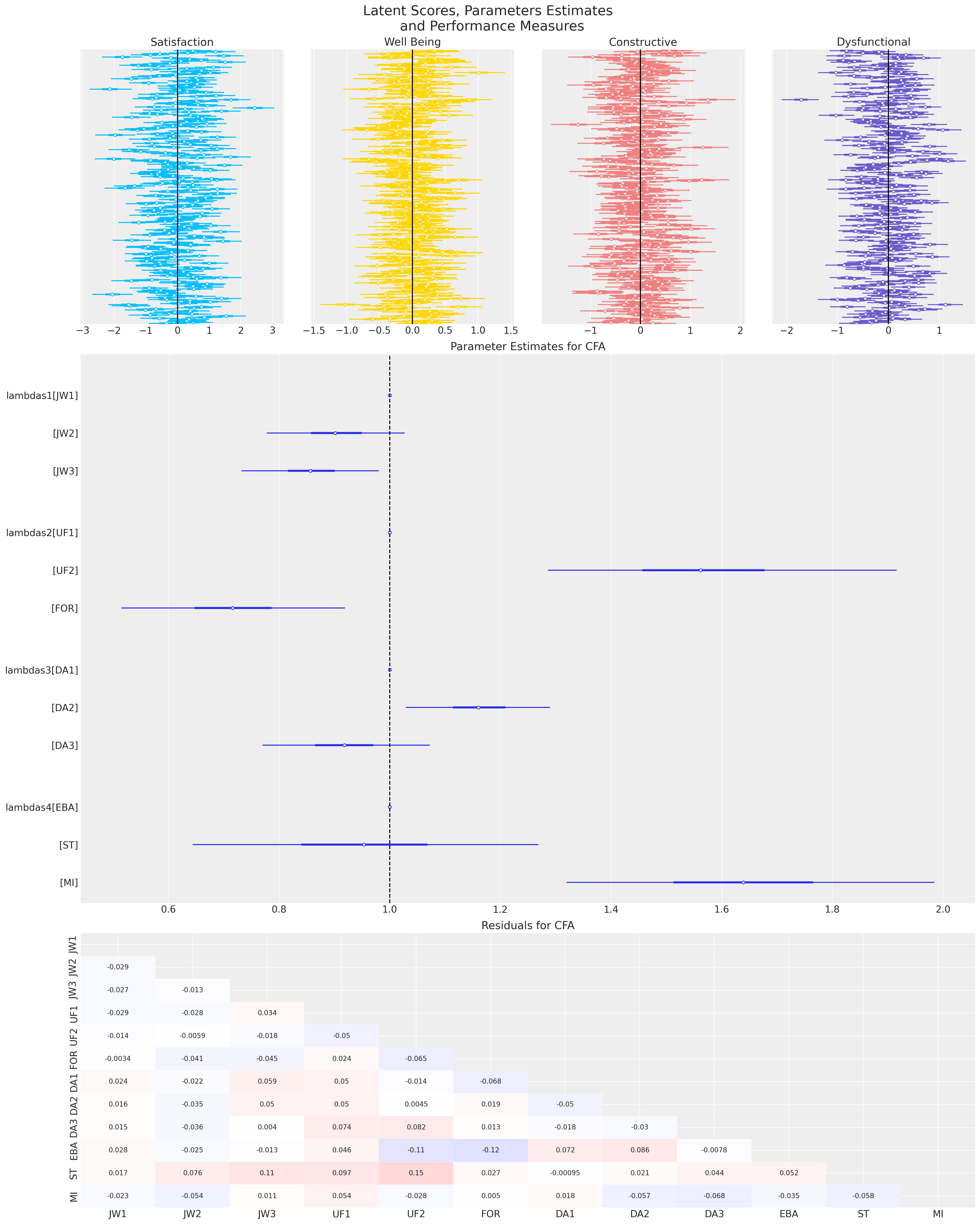 where \(\Lambda\) is a 12 x 4 matrix, and \(\eta\) is an \(N\) x 4 matrix, for \(N\) observations i.e. the matrix of latent scores on each of the four factors for all individual responses. In the measurement model we’re aiming to ensure that the observed metrics are well grouped under a single factor. That they “move” well together and respond to changes in the factor.
