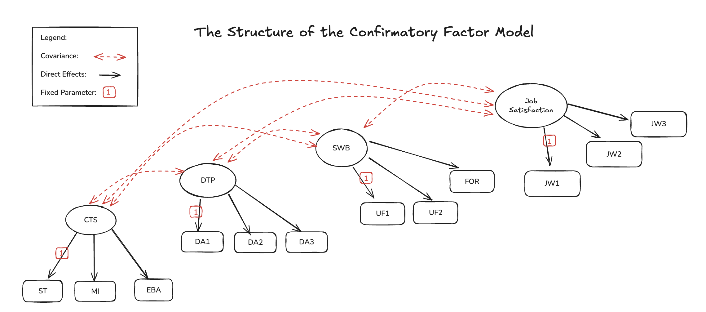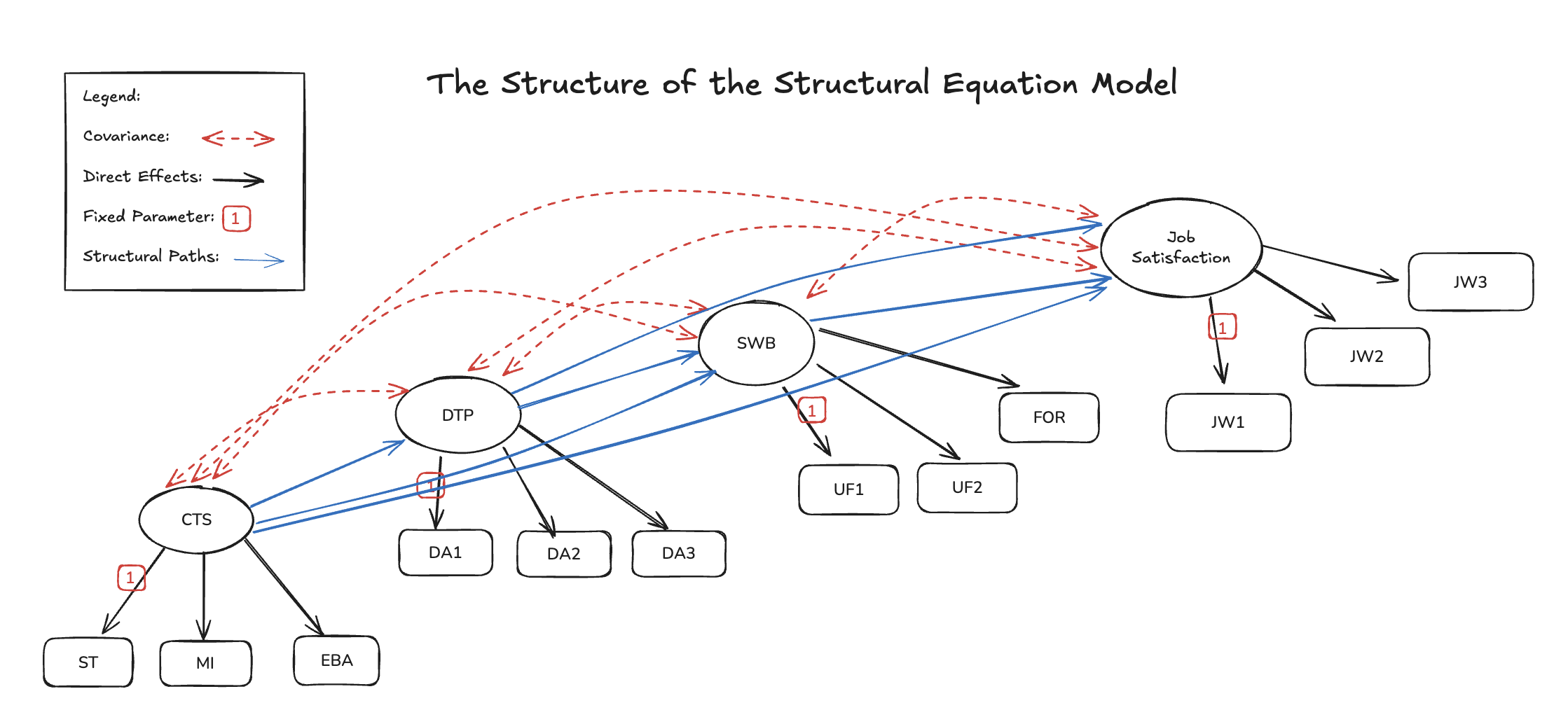 The Structural model encodes the regression paths between the latent constructs. Mathematically this is achieved within a 4 X 4 matrix \(B\), where the latent factors are specified as predictors of other latent factors as theory dictates i.e no latent factor predicts itself, but some may bear on others. In our case we’re aiming to see how constructive thought strategies predicts job satisfaction. The influence paths of one factor on another can be direct and mediated through the other factors.