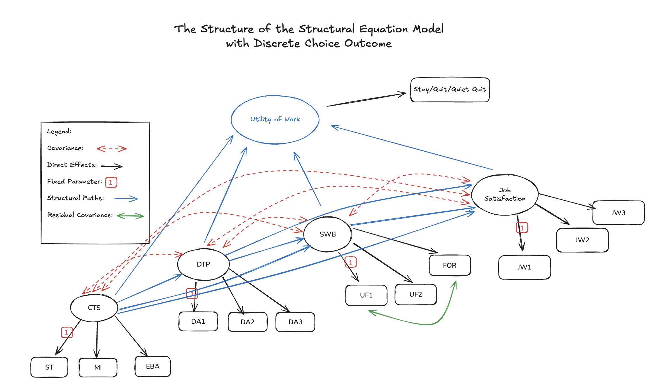 The “action” in human decision making is often understood to be driven by these hard-to-quantify constructs that determine motivation. SEM with a discrete choice component offers us a way to model these processes, while allowing for measurement error between the observables and the latent drivers of choice. Secondly, we are triangulating the values of the system between two sources of observable data. On the one hand, we measure latent constructs in the SEM with a range of survey measures (JW1, JW2, … ) but then calibrate the consequences of that measurement against revealed choice data. This dual calibration offers a powerful approach to understanding how latent dispositions translate into observable actions.