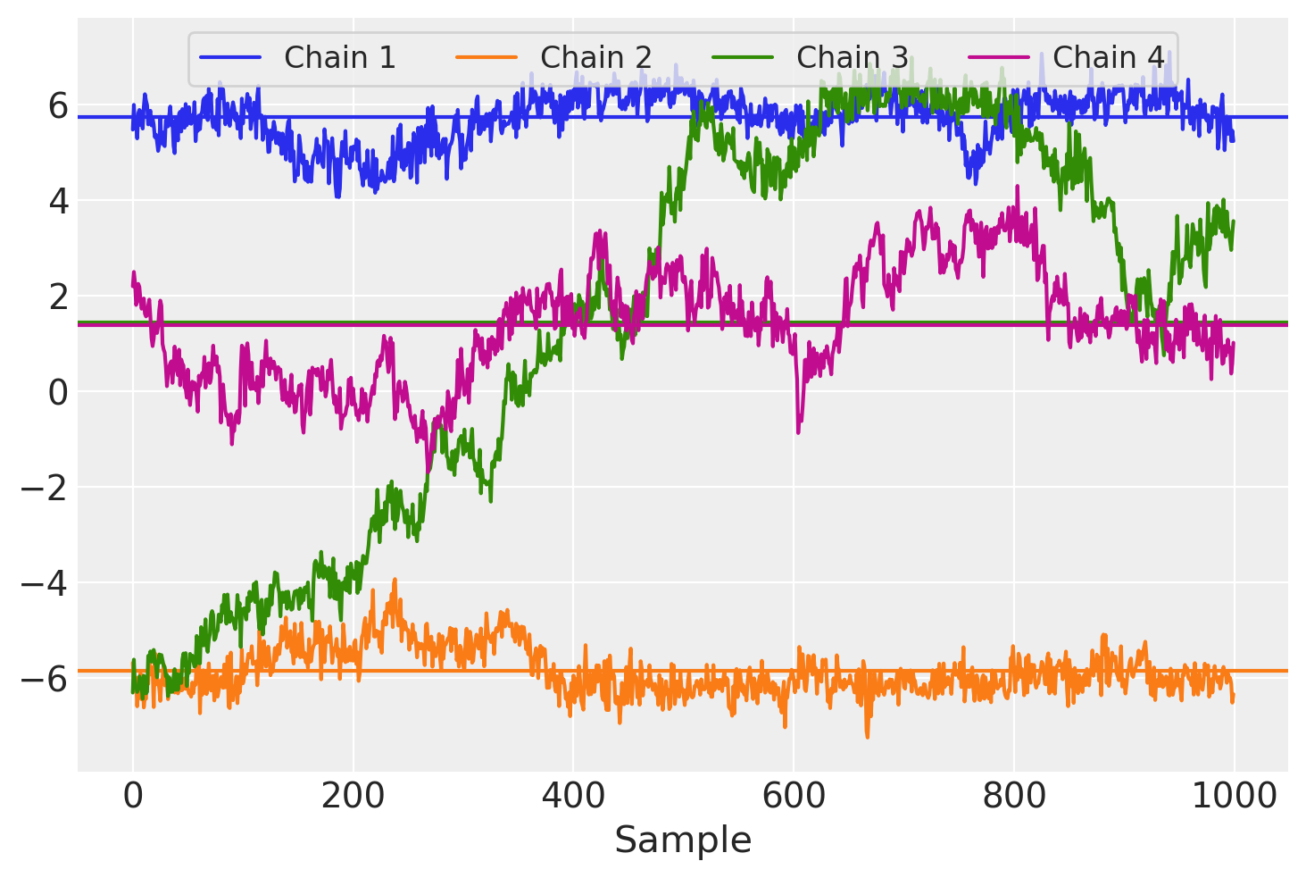 Each chain appears to have a different sample mean and we can also see that there is a great deal of autocorrelation across chains, manifest as long-range trends over sampling iterations.