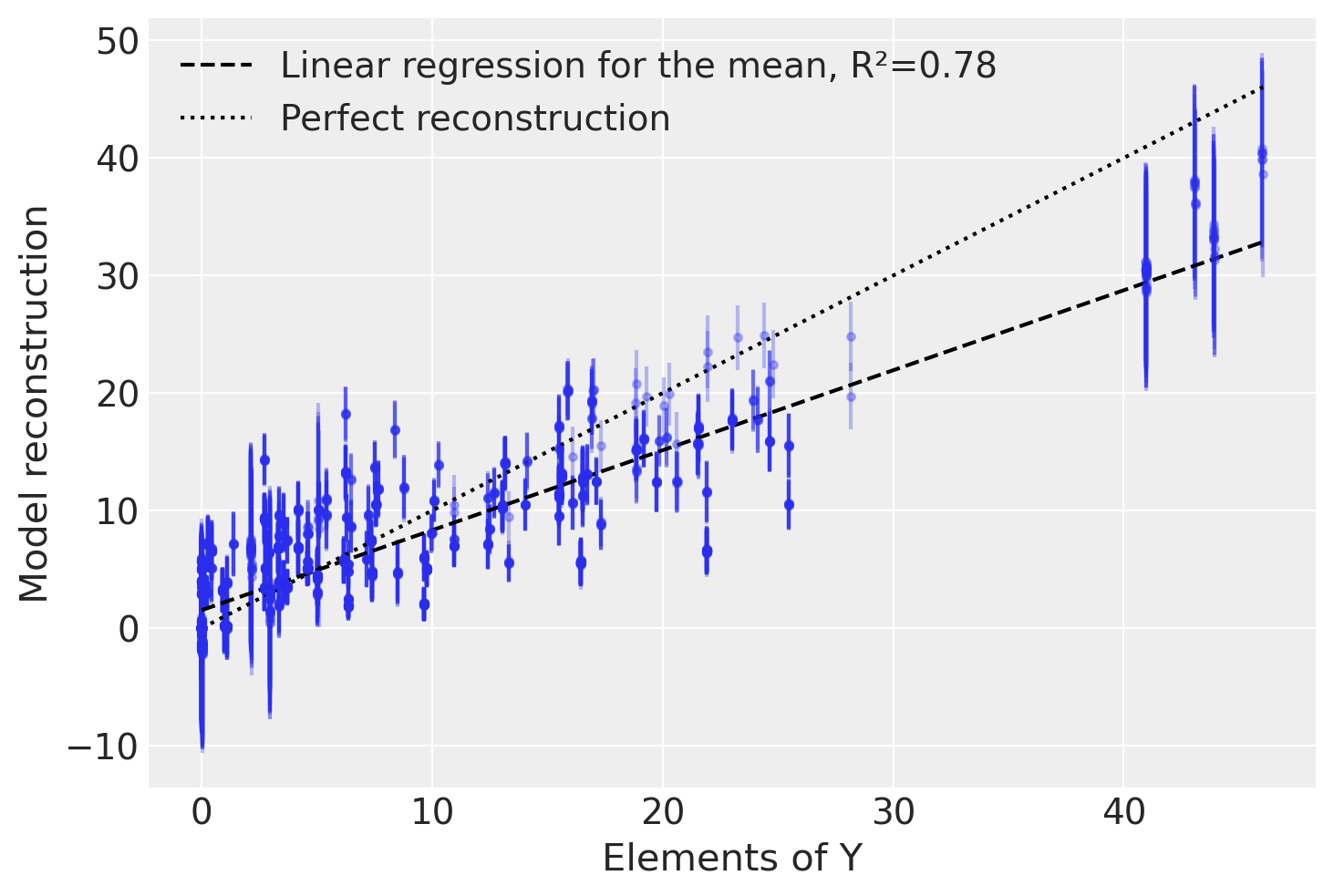 To check how well our model has captured the original data, we will test how well we can reconstruct it from the sampled \(W\) and \(F\) matrices. For each element of \(Y\) we plot the mean and standard deviation of \(X = W F\), which is the reconstructed value based on our model.