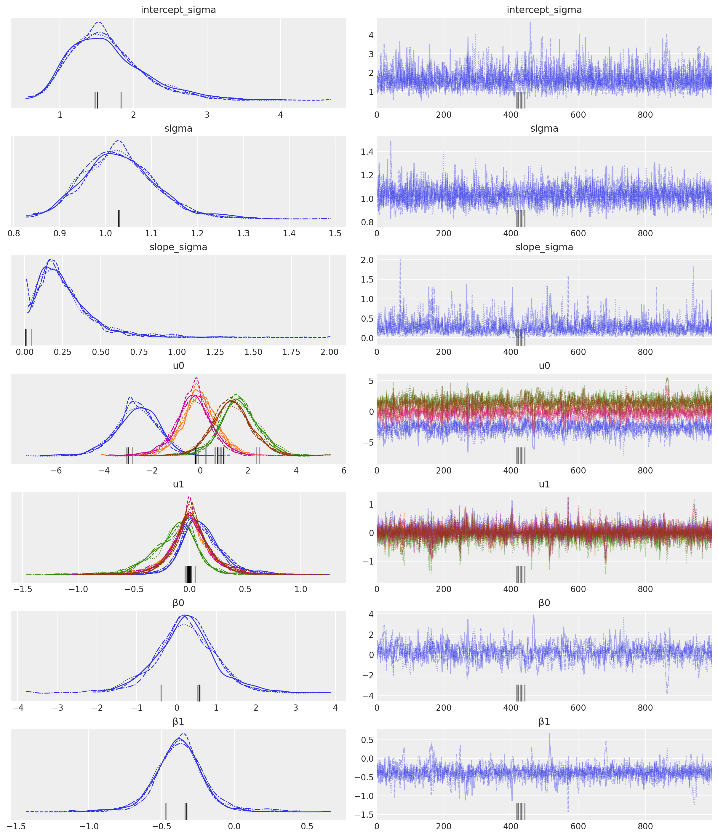 NUTS: [β0, β1, intercept_sigma, slope_sigma, u0, u1, sigma]