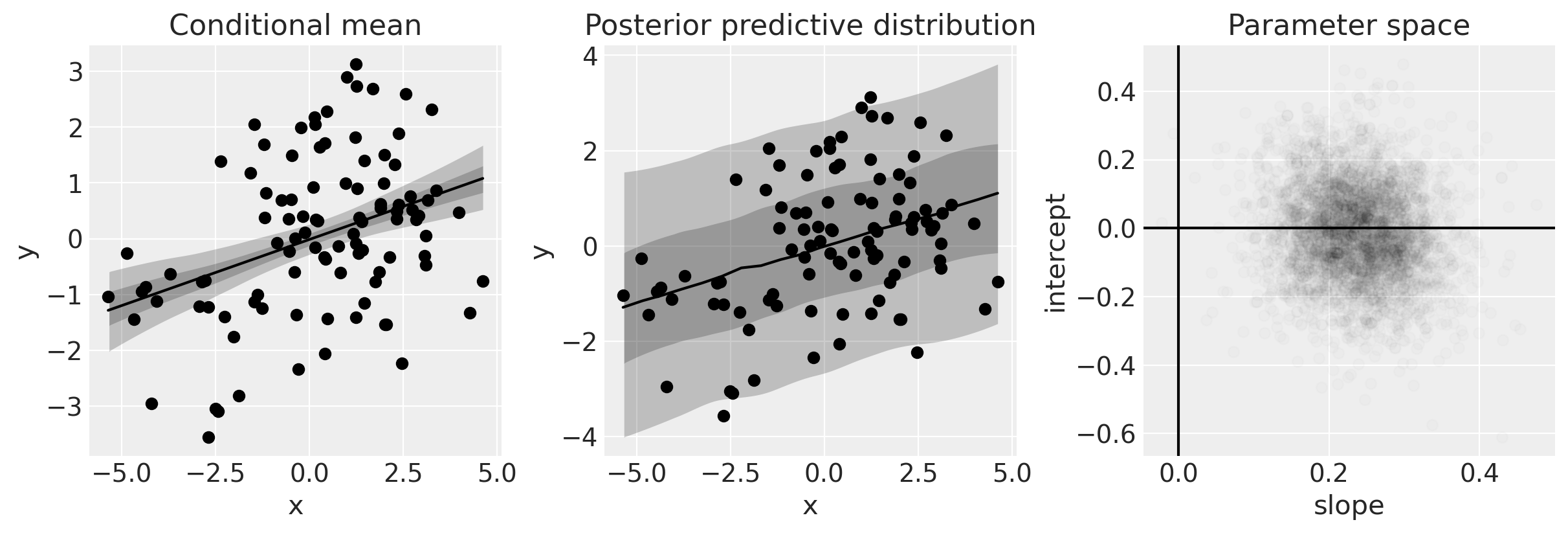The plot in the middle shows the conditional posterior predictive distribution, which gives a statement about the data we expect to see. Intuitively, this can be understood as not only incorporating what we know of the model (left plot) but also what we know about the distribution of error.