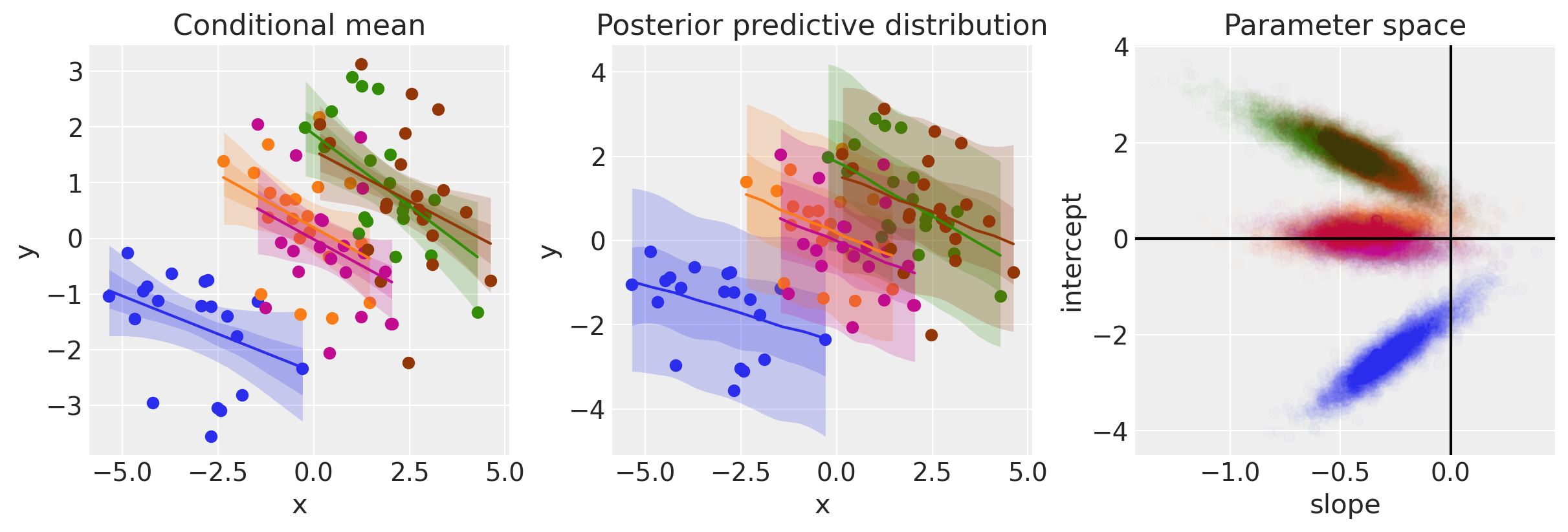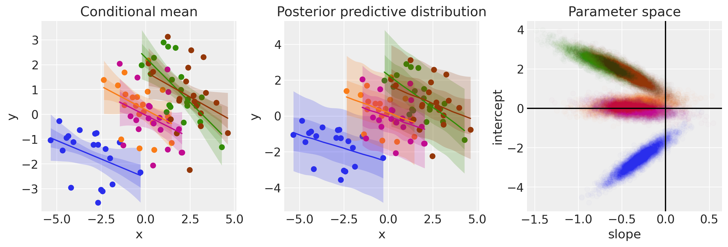 In contrast to Model 1, when we consider groups we can see that now the evidence points toward negative relationships between \(x\) and \(y\). We can see that from the negative slopes in the left and middle panels of the plot above, as well as from the majority of the posterior samples for the slope parameter being negative in the left panel above.