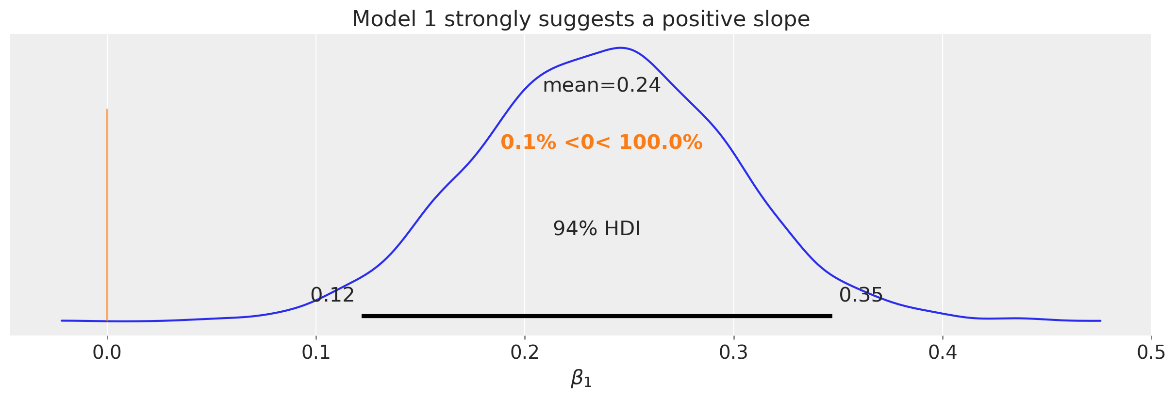 One of the clear things about this analysis is that we have credible evidence that \(x\) and \(y\) are positively correlated. We can see this from the posterior over the slope (see right hand panel in the figure above) which we isolate in the plot below.