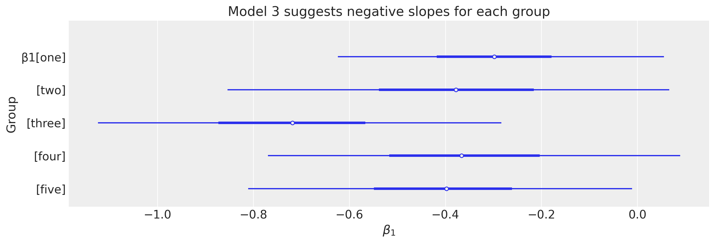 The plot below takes a closer look at the group level slope parameters.