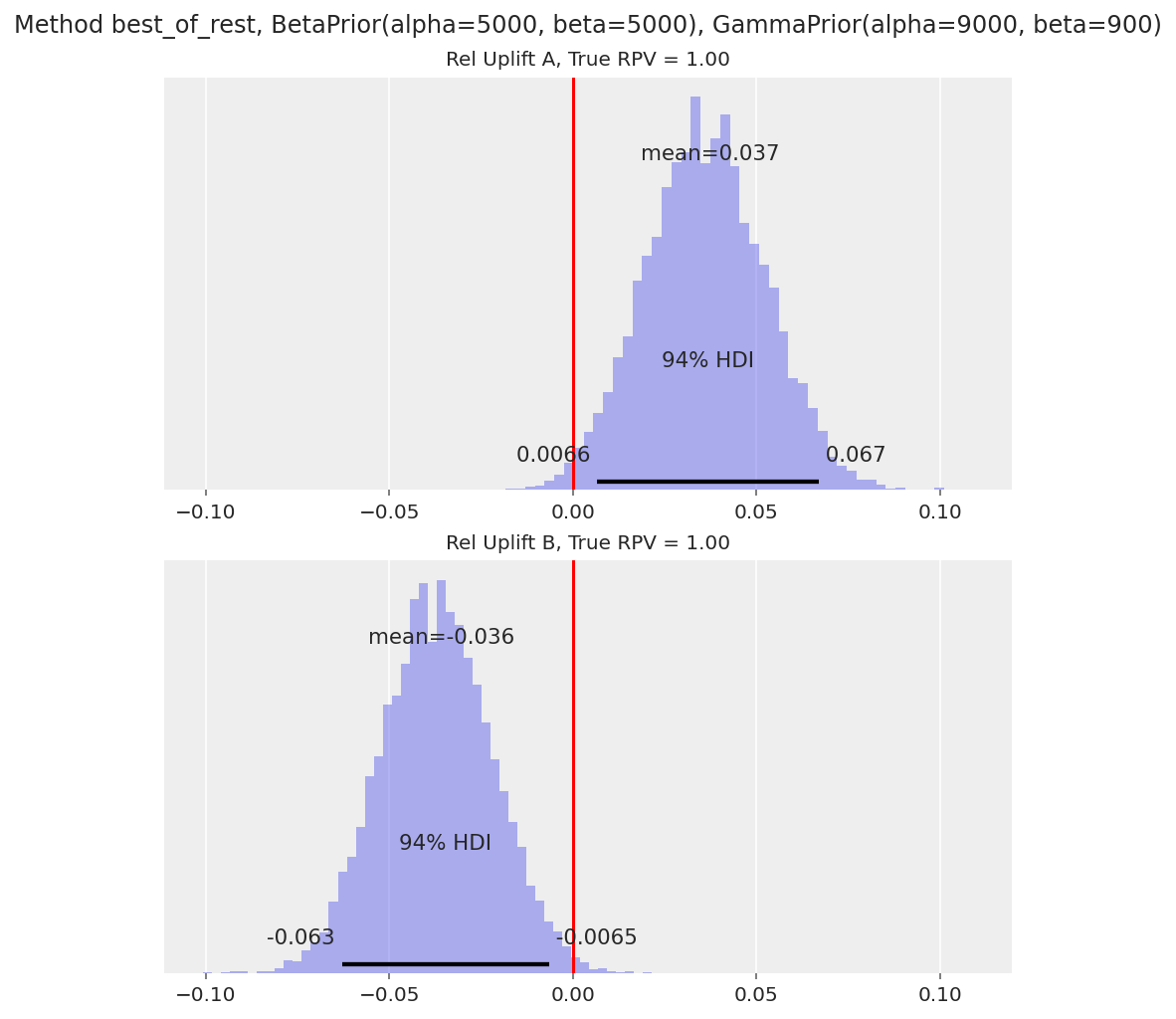 alphaandbeta. Contrary to the above, a strong prior would imply that the relative uplift distribution is thin, i.e. our prior belief is that the variants are not very different from each other.