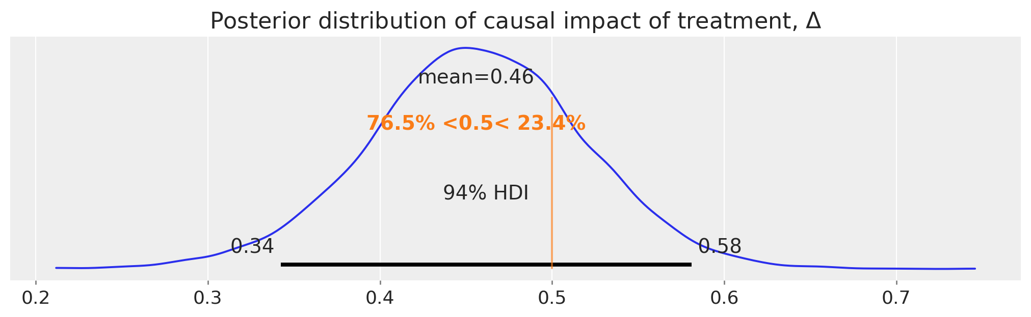 The difference between this counterfactual expectation and the observed values (post treatment in the treatment condition) represents our inferred causal impact of the treatment. Let’s take a look at that posterior distribution in more detail: