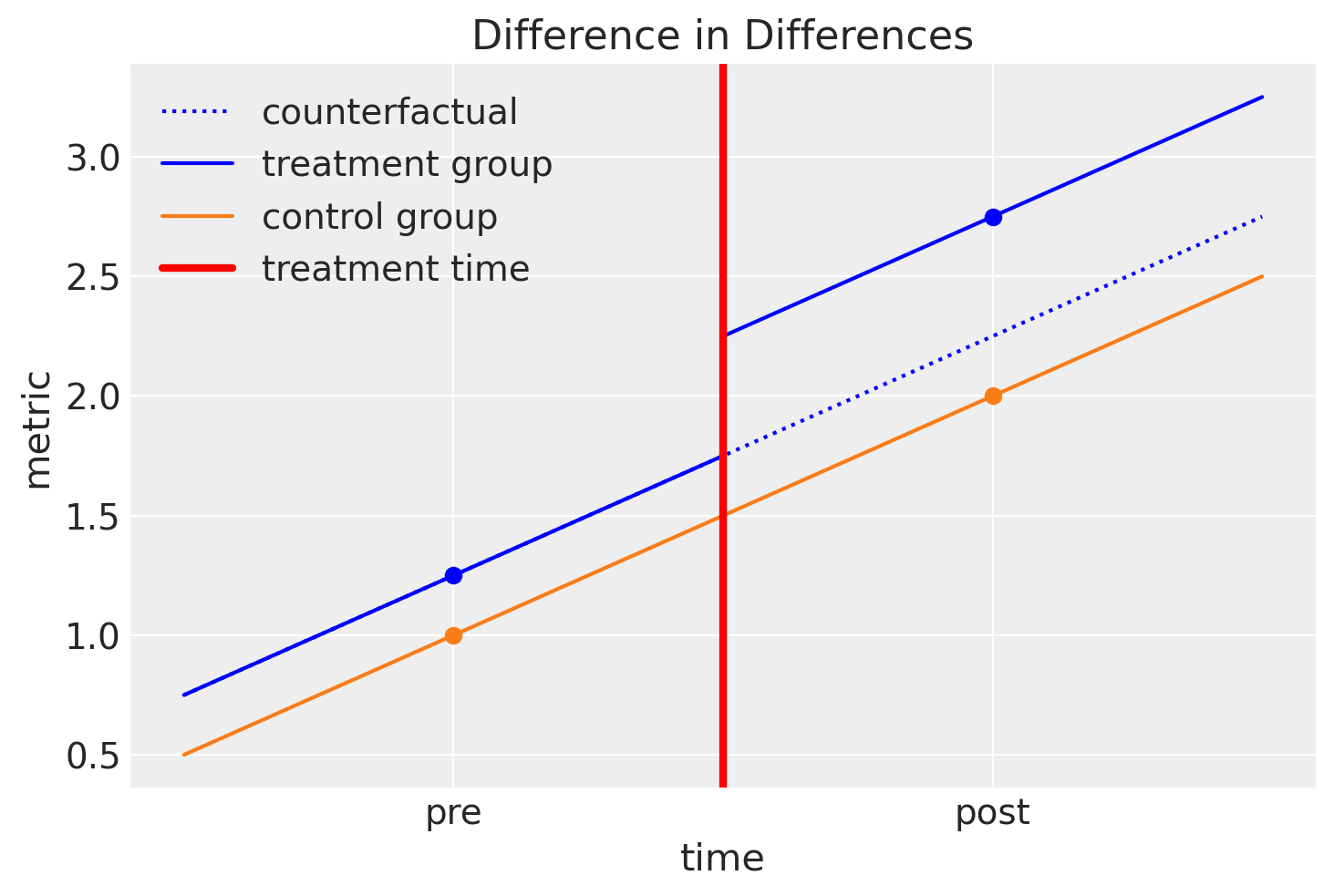 Note that our desire to estimate the causal impact of a treatment involves counterfactual thinking. This is because we are asking “What would the post-treatment outcome of the treatment group be if treatment had not been administered?” but we can never observe this.