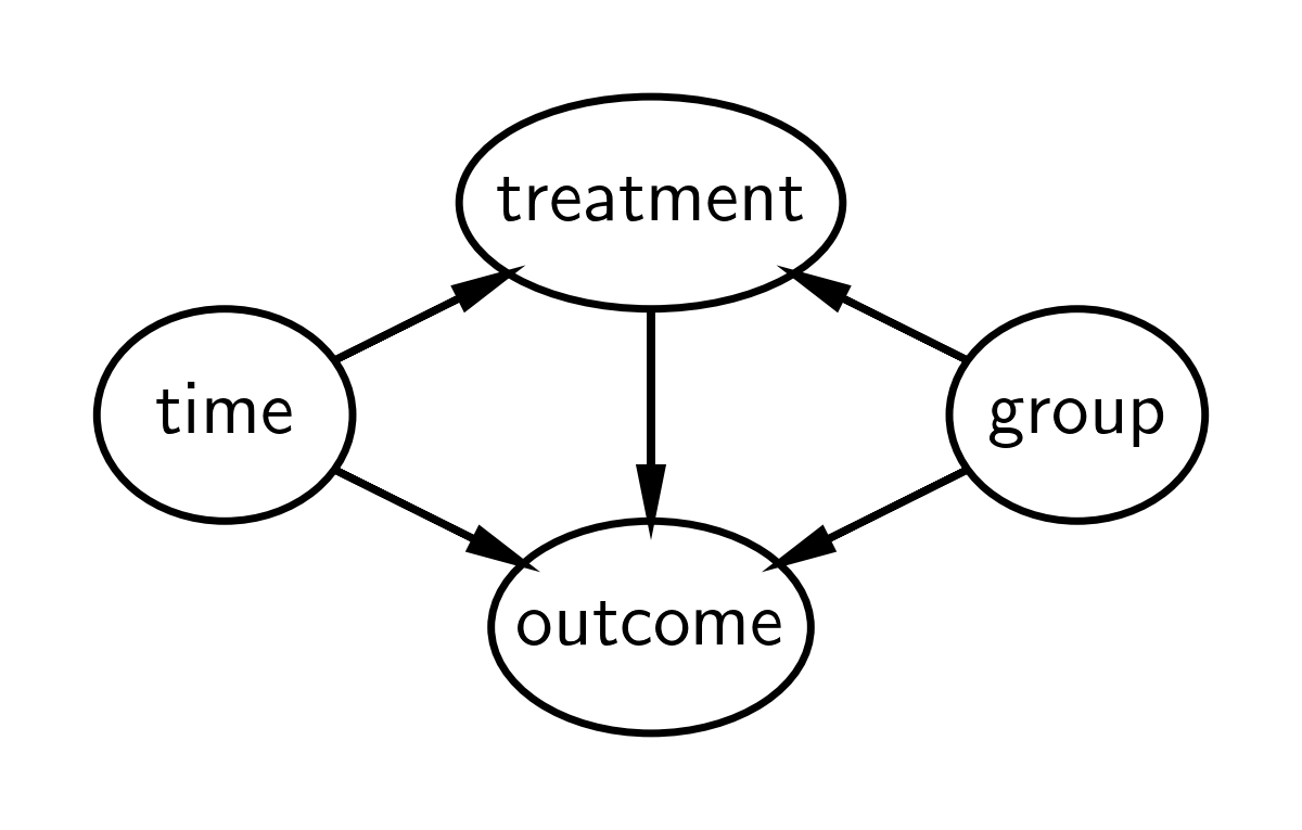 Treatment status of an observation is causally influenced by group and time. Note that treatment and group are different things. Group is either experimental or control, but the experimental group is only ‘treated’ after the intervention time, hence treatment status depends on both group and time.