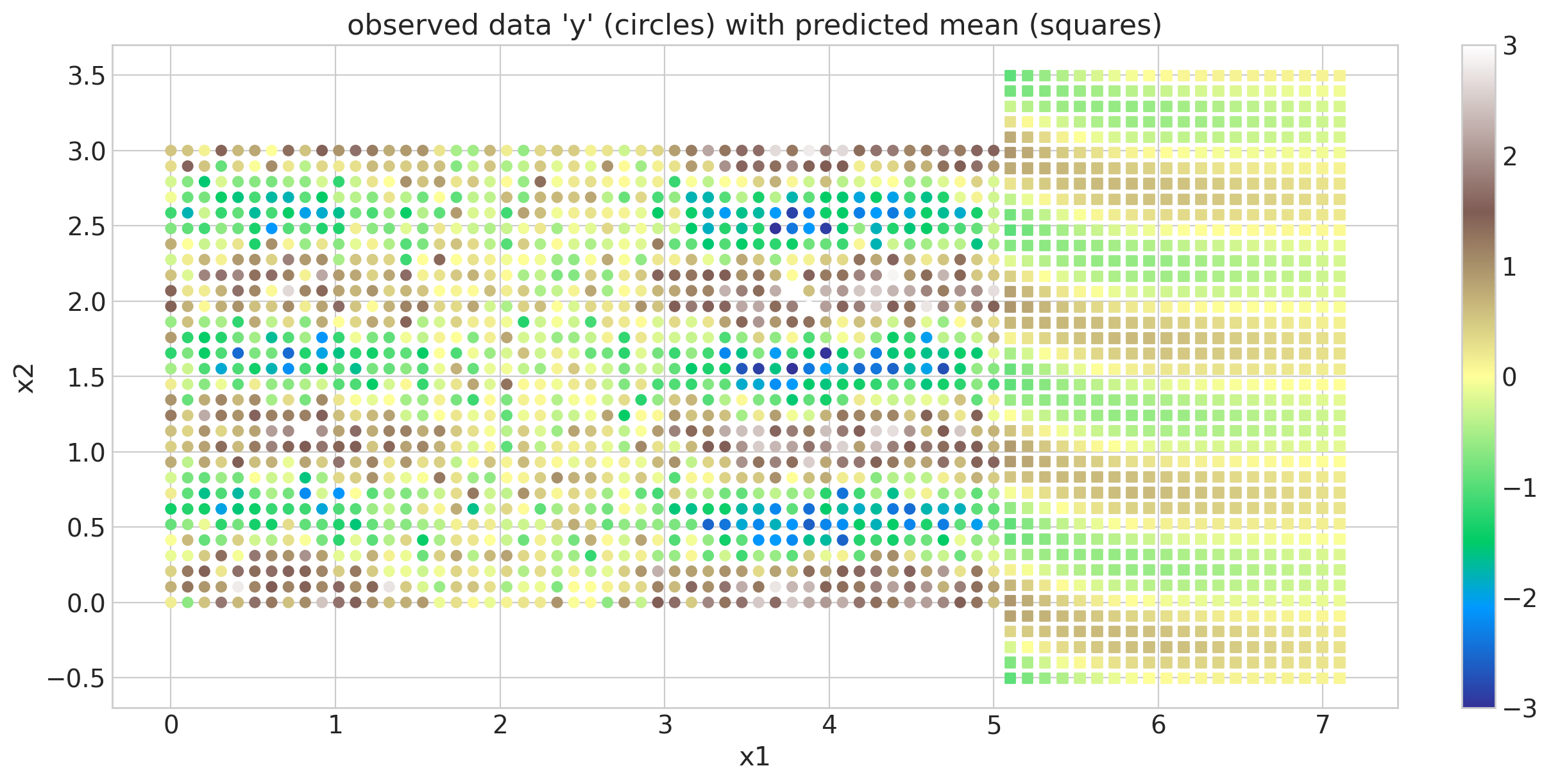 Below we show the original data set as colored circles, and the mean of the conditional samples as colored squares. The results closely follow those given by the gp.MarginalKron implementation.