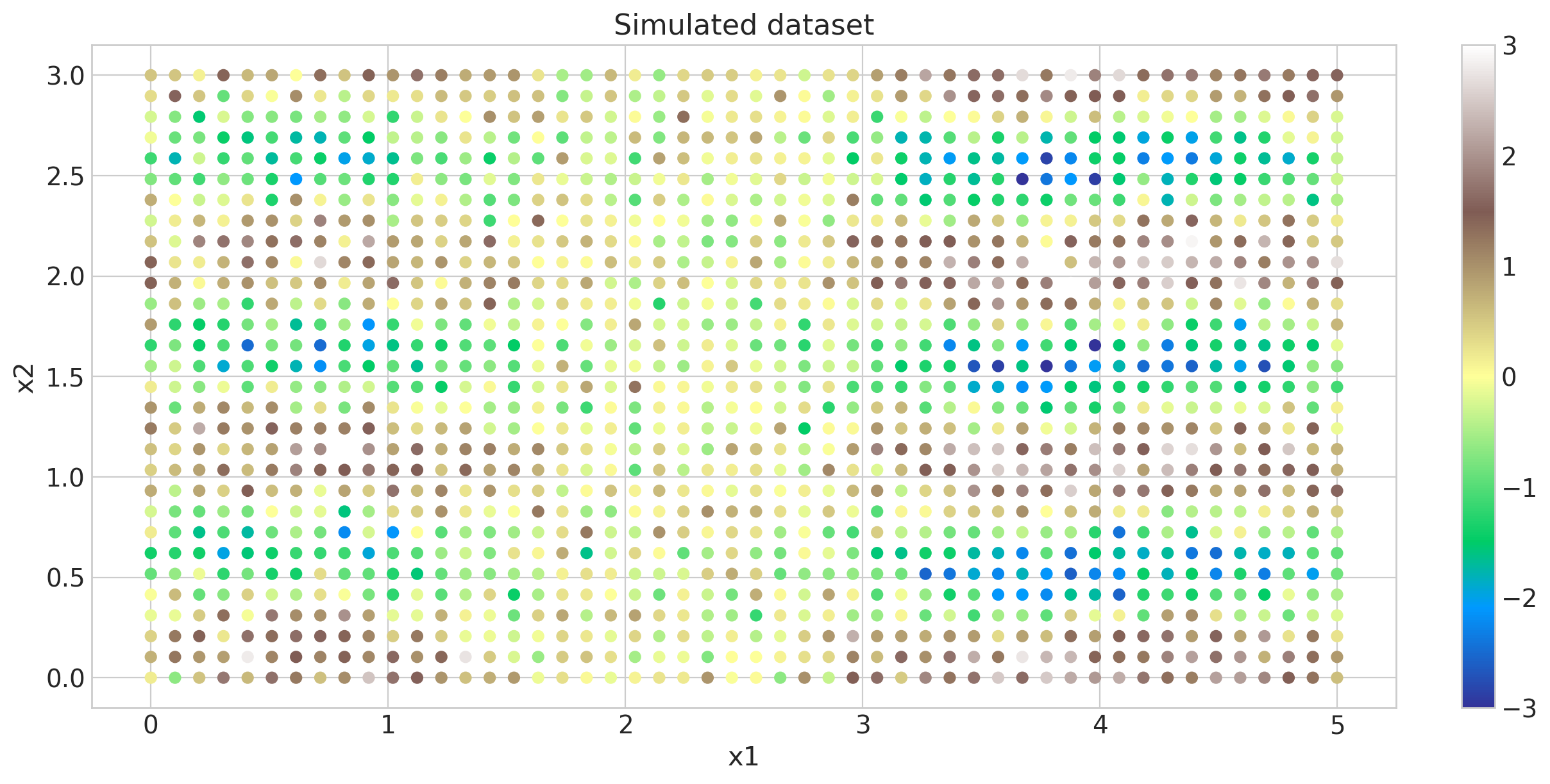 We’ll simulate a two dimensional data set and display it as a scatter plot whose points are colored by magnitude. The two dimensions are labeled x1 and x2. This could be a spatial dataset, for instance. The covariance will have a Kronecker structure since the points lie on a two dimensional grid.
