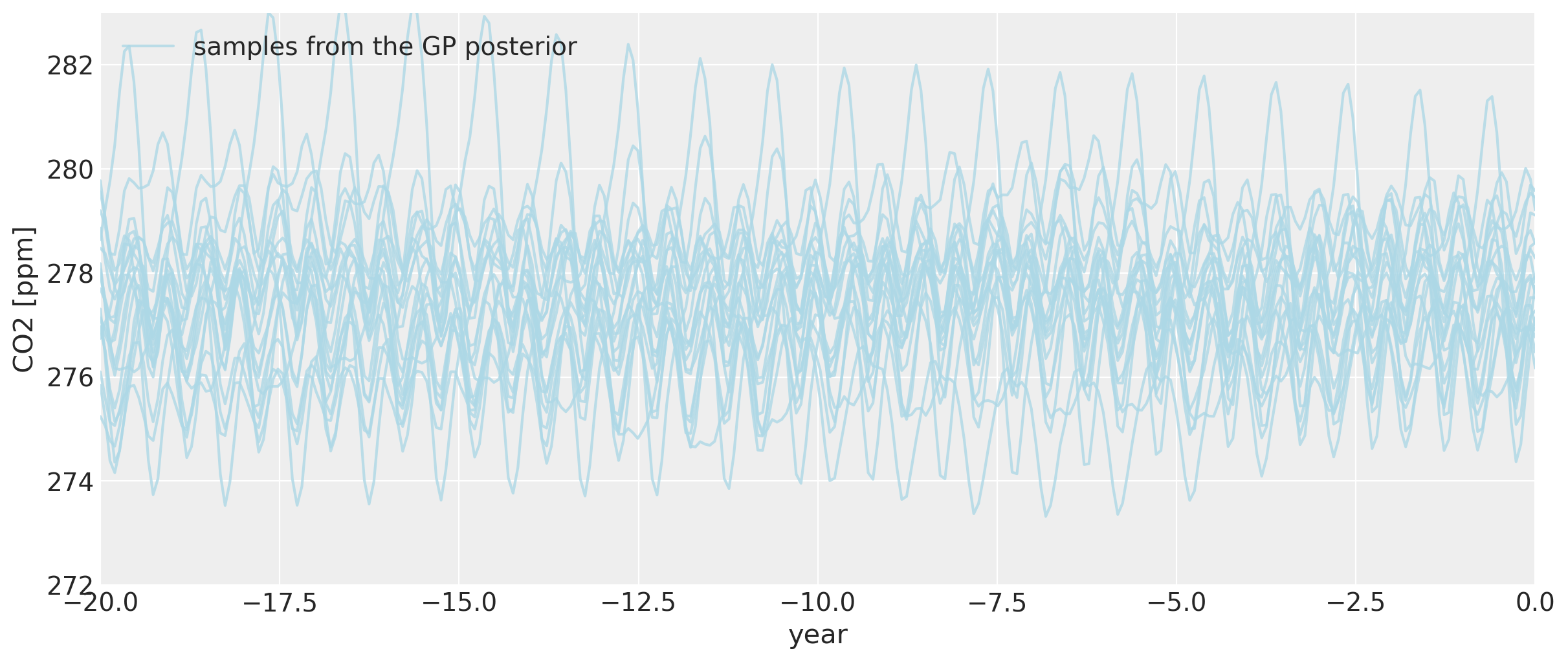 We can see that far back in time, we can backcast even the seasonal behavior to some degree. The ~two year of uncertainty in the x locations allows them to be shifted onto the nearest part of the seasonal oscillation for that year. The magnitude of the oscillation is the same as it is now in modern times. While the cycle in each of the posterior samples still has an annual period, its exact morphology is less certain since we are far in time from the dates when the Mauna Loa data was collected.