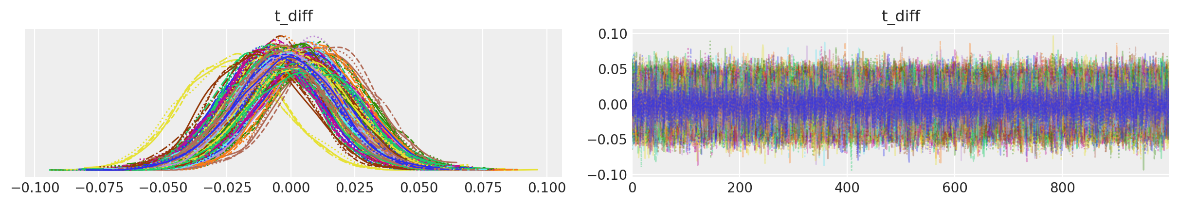 In the traceplot for t_diff, we can see that the posterior peaks for the different inputs haven’t moved much, but the uncertainty in location is accounted for by the sampling.