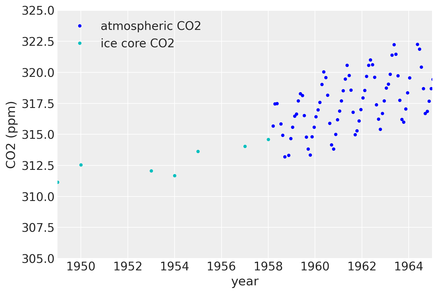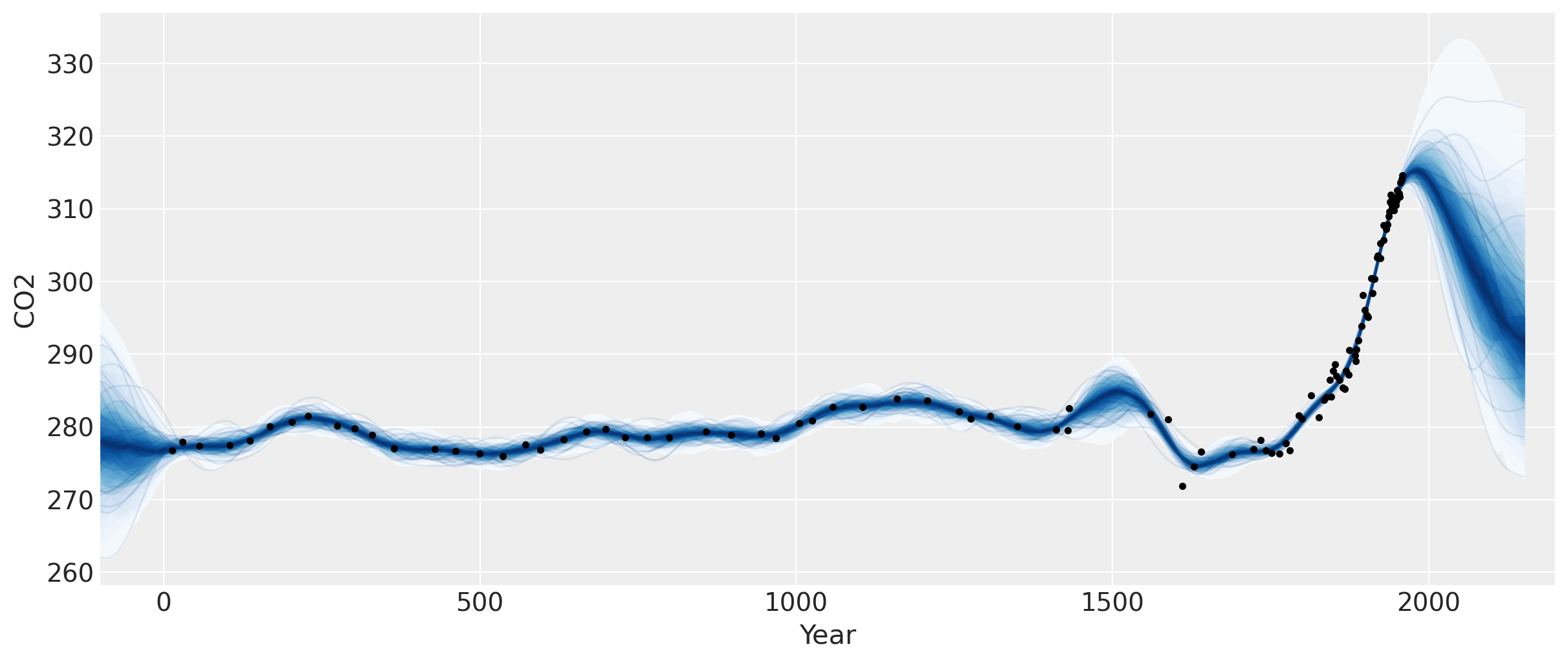 Below is a plot of the data since the 18th century (Mauna Loa and Law Dome ice core data) used to fit the model. The light blue lines are a bit hard to make out at this level of zoom, but they are samples from the posterior of the Gaussian process. They both interpolate the observed data, and represent plausible trajectories of the future forecast. These samples can alternatively be used to define credible intervals.