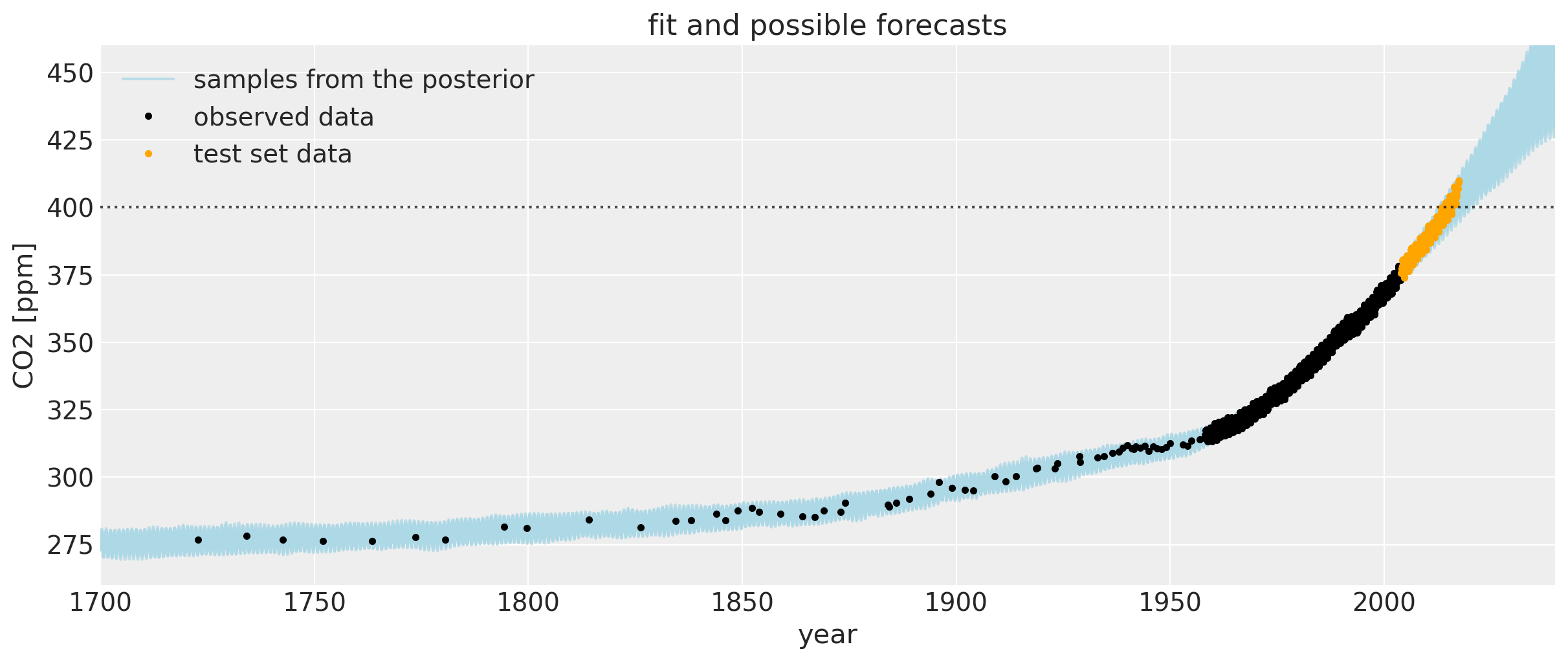 Let’s zoom in for a closer look at the uncertainty intervals at the area around when the CO2 levels first crossed 400 ppm. We can see that the posterior samples give a range of plausible future trajectories. Note that the data plotted in orange were not used in fitting the model.