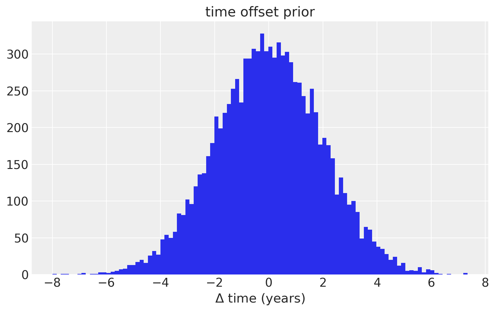 To model uncertainty in \(x\), or time, we place a prior distribution over each of the observation dates. So that the prior is standardized, we specifically use a PyMC3 random variable to model the difference between the date given in the data set, and it’s error. We assume that these differences are normal with mean zero, and standard deviation of two years. We also enforce that the observations have a strict ordering in time using the ordered transform.