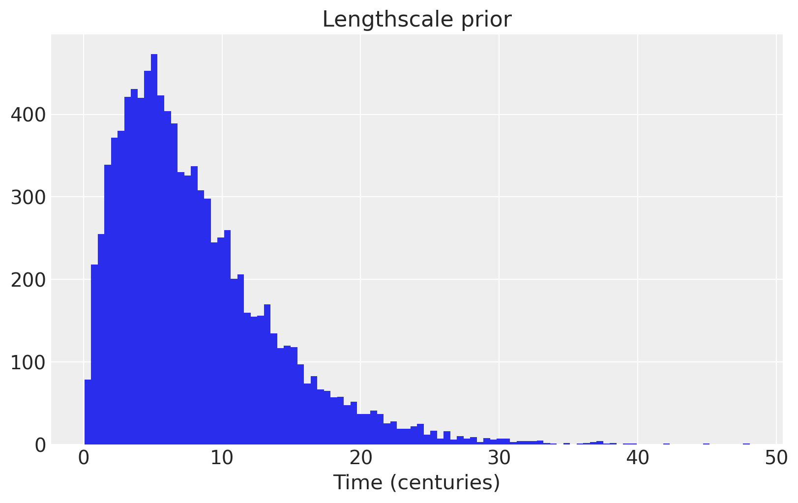 We use an informative prior on the lengthscale that places most of the mass between a few and 20 centuries.