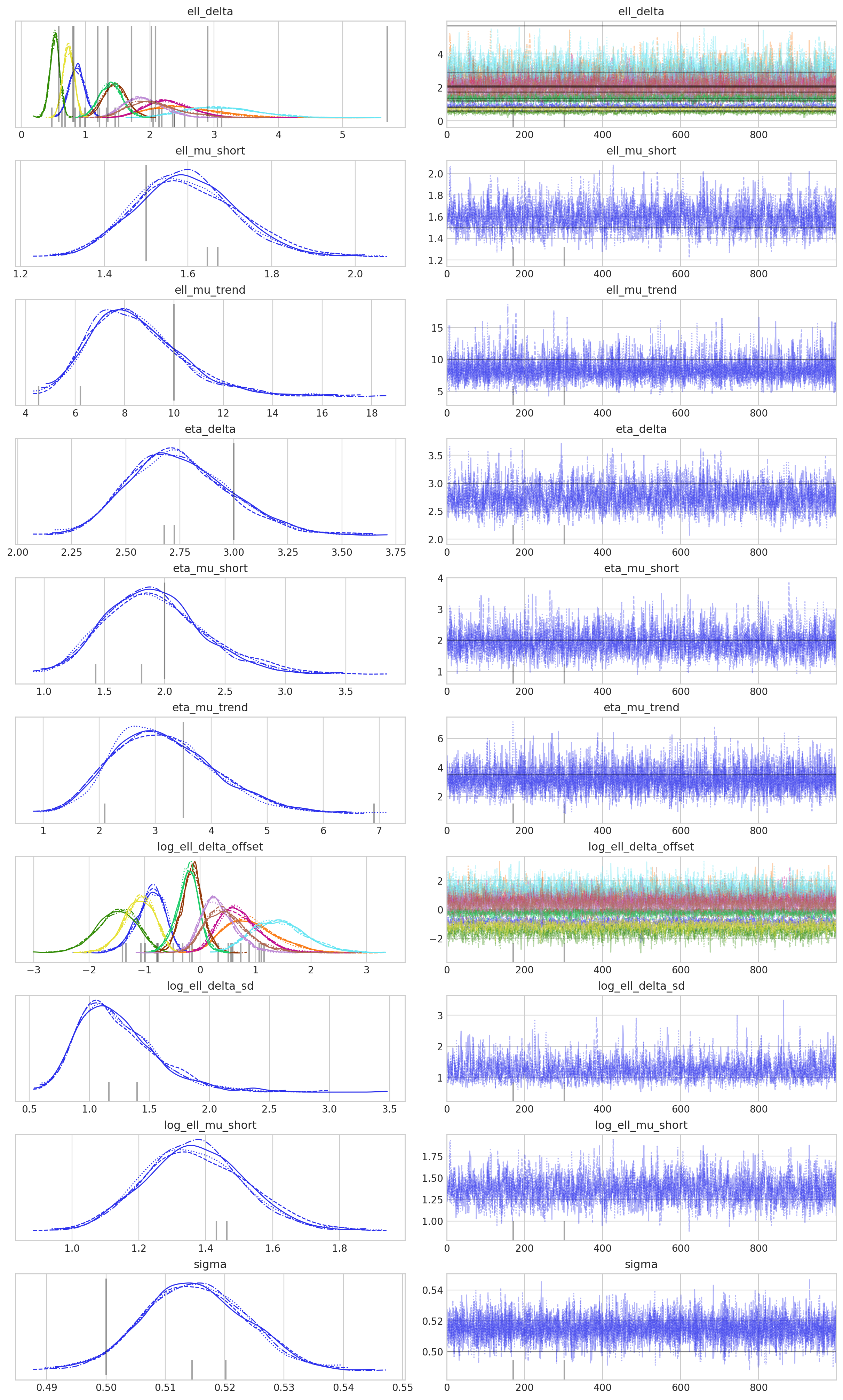 ell_mu_trend_true = 10), models the long-term linear trend in the data. The magnitude of variability in this trend is controlled byeta_mu_trend_true, which is also quite big relative to the other components, making this trend important in the data generating process.Short-Term Variations GP: Another GP, also using a Matérn covariance function but with a shorter length scale (