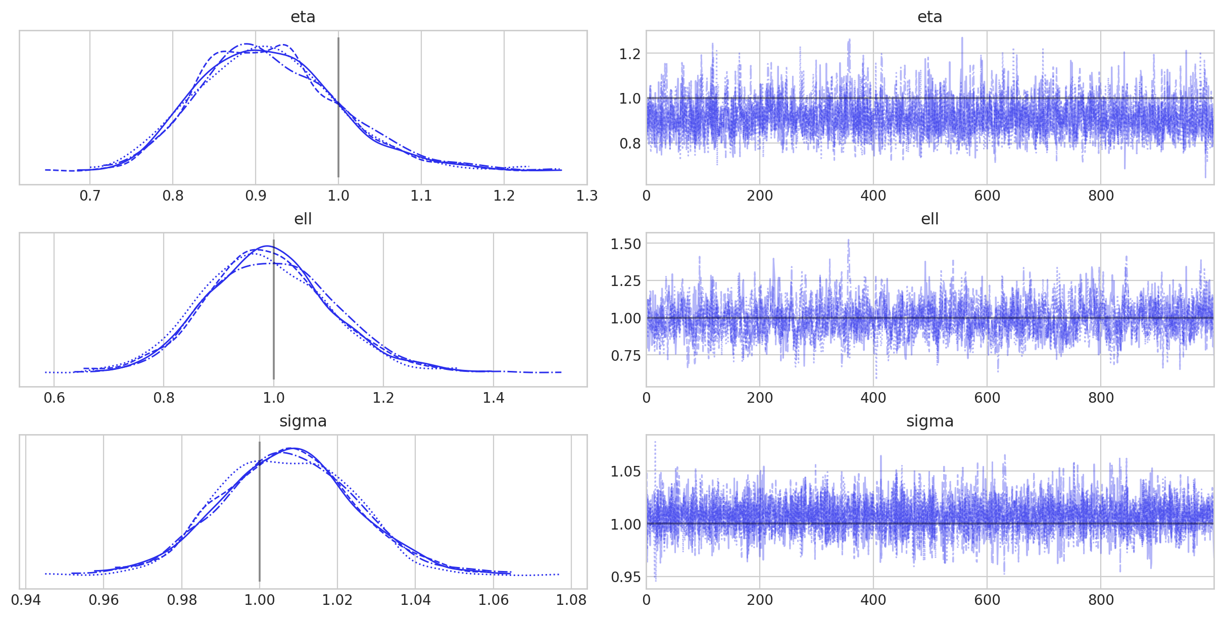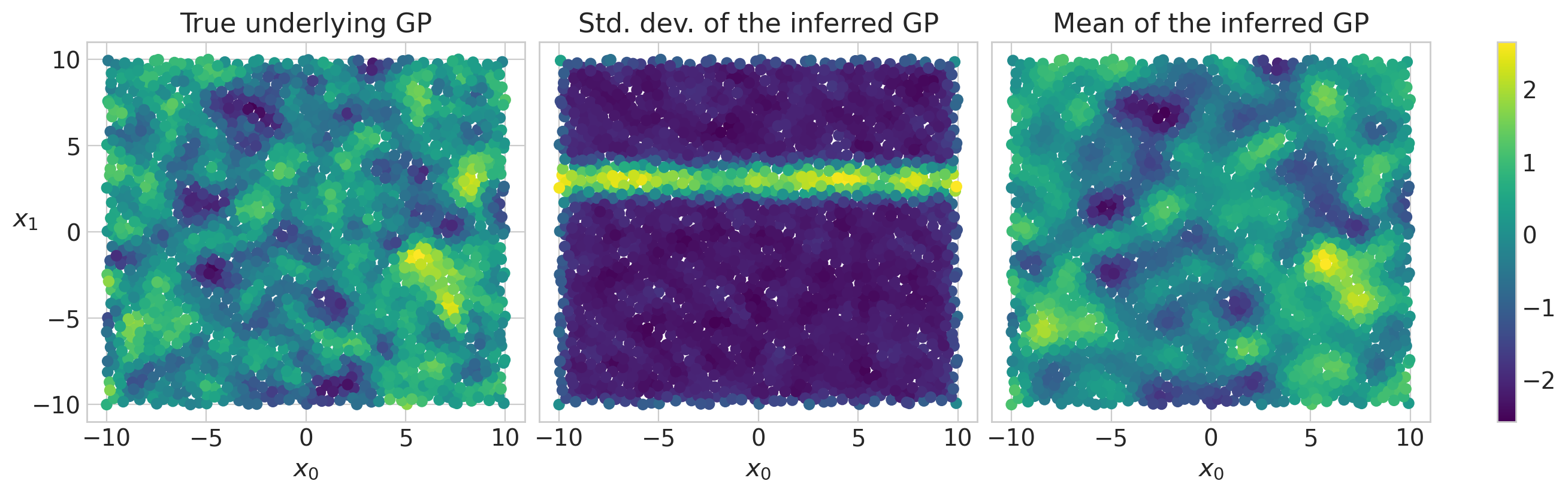 Sampling diagnostics all look good, and we can see that the underlying GP was inferred nicely. We can also see the increase in uncertainty outside of our training data as a horizontal stripe in the middle panel, showing the increased standard deviation of the inferred GP here.