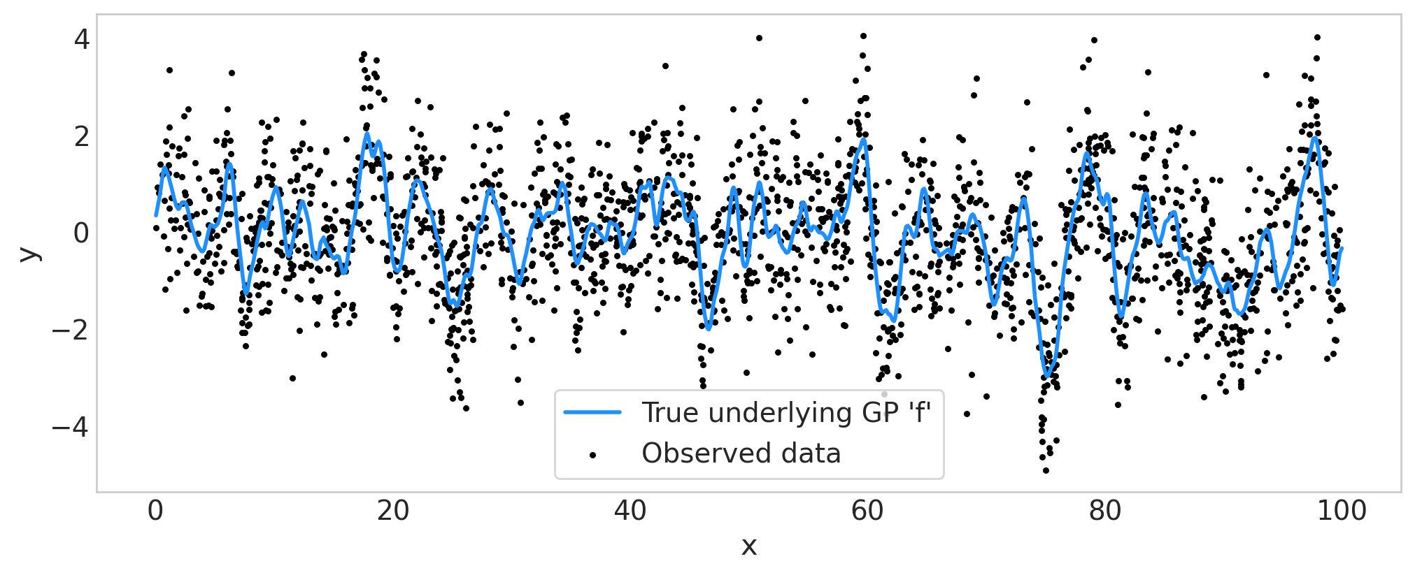 ax.plot(x, f_true, color="dodgerblue", lw=2, label="True underlying GP 'f'")