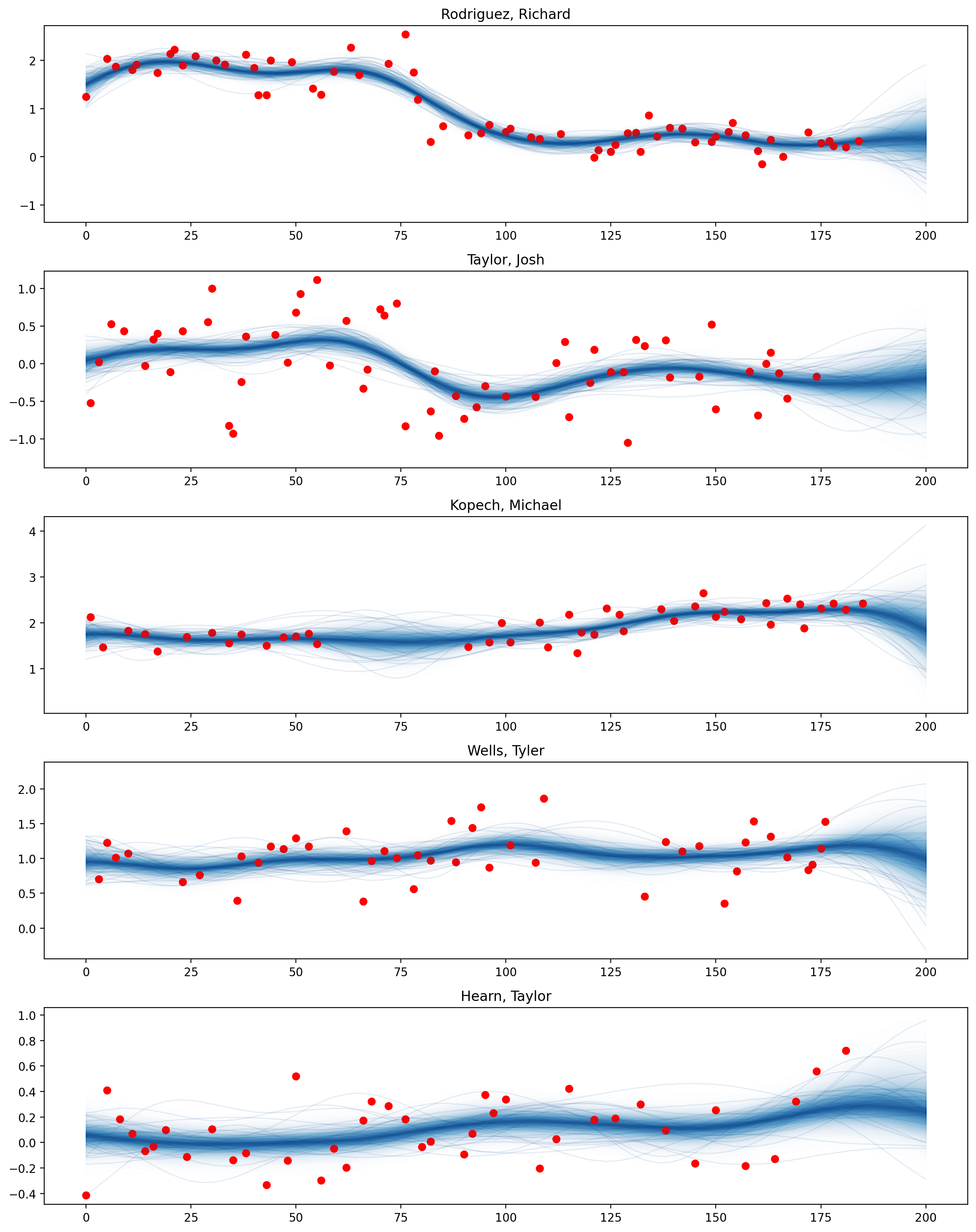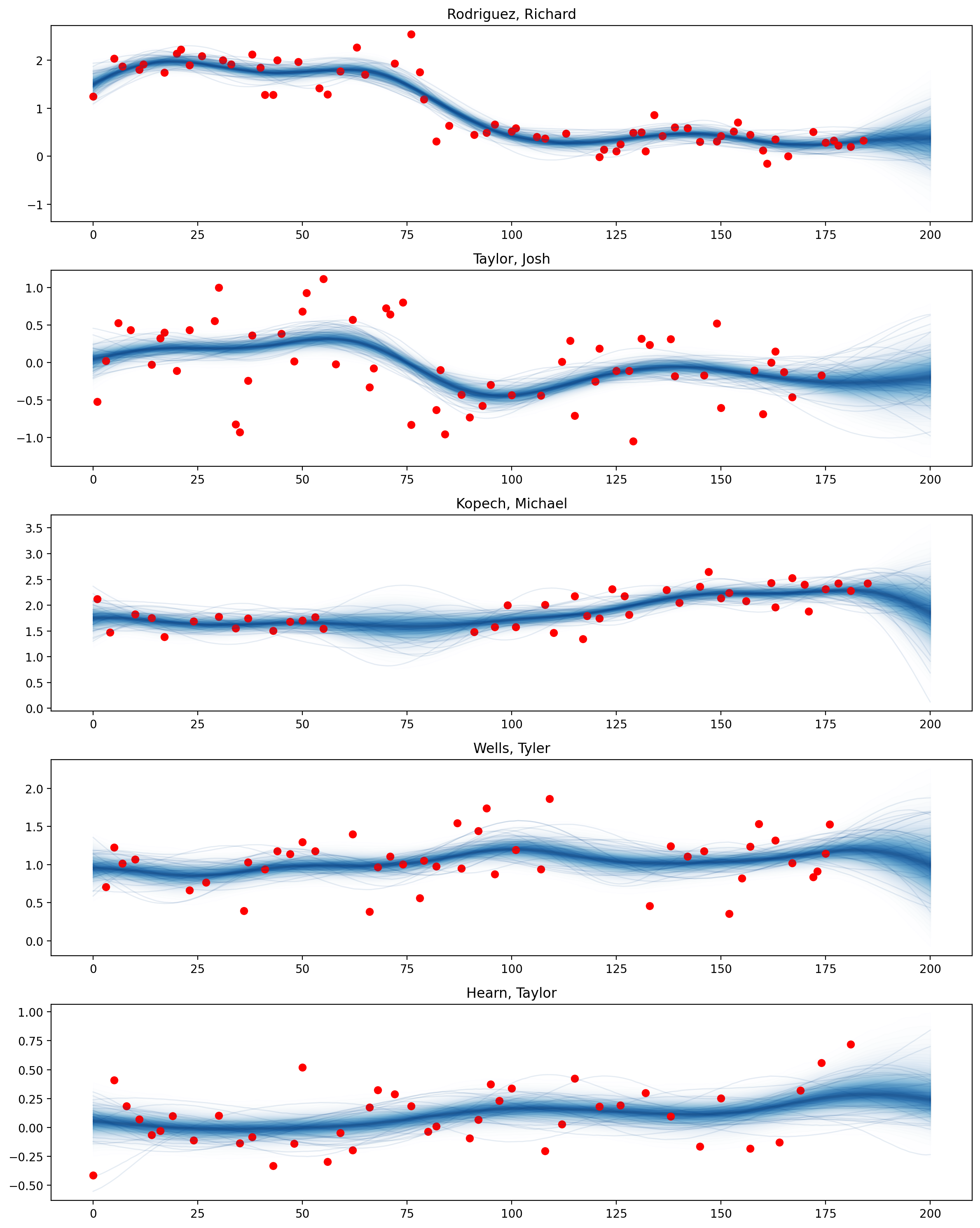 The advantage of Multi-output Gaussian Processes is their capacity to simultaneously learn and infer many outputs which have the same source of uncertainty from inputs. In this example, we model the average spin rates of several pitchers in different games from a baseball dataset.