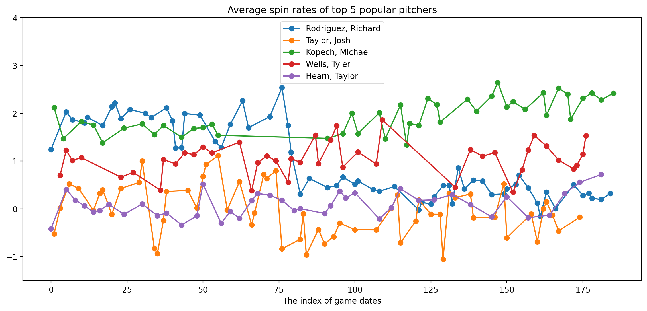 It can be seen that the average spin rate of Rodriguez Richard decreases significantly from the 75th game dates. Besides, Kopech Michael’s performance improves after a break of several weeks in the middle, while Hearn Taylor has performed better recently.