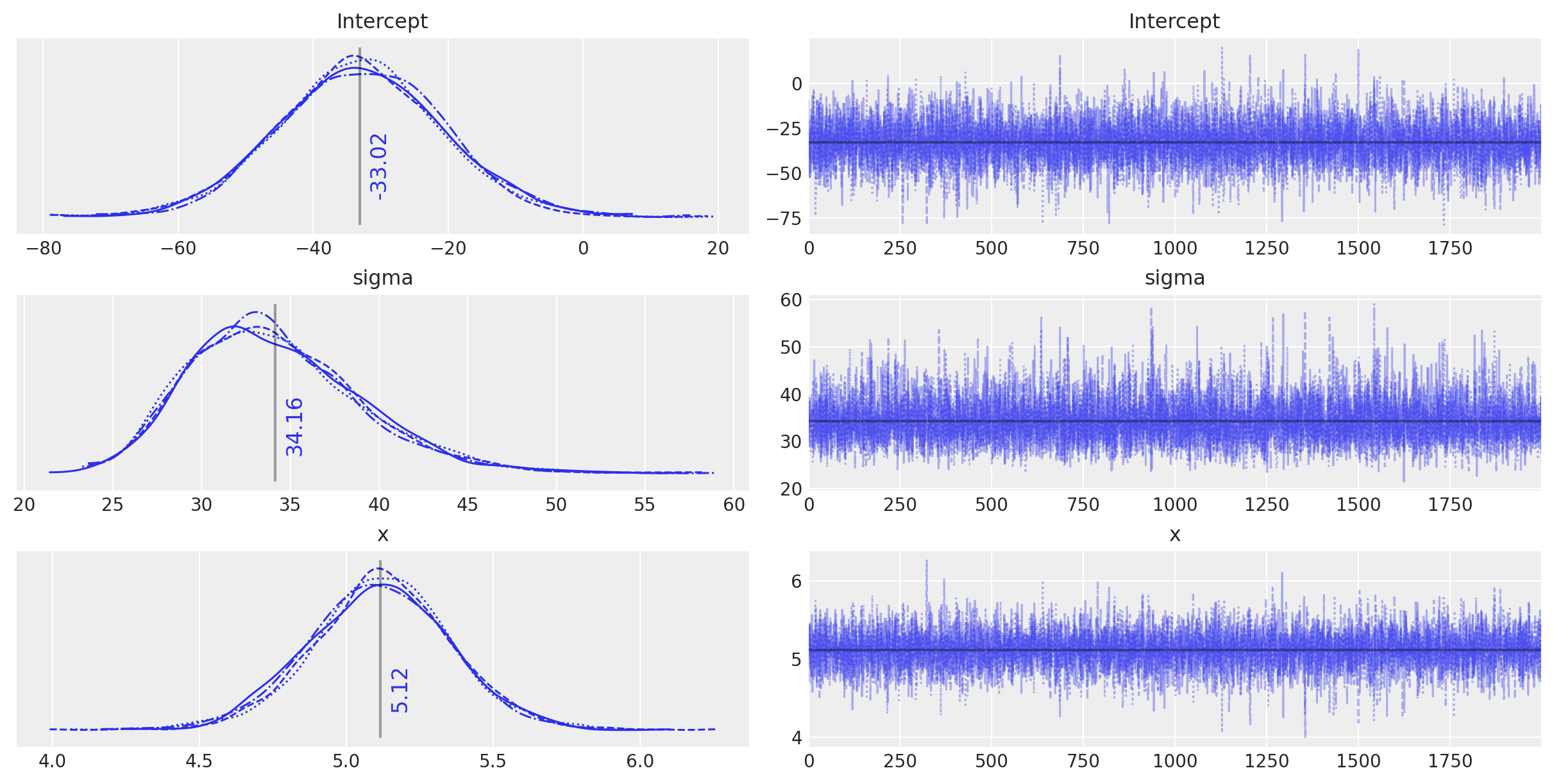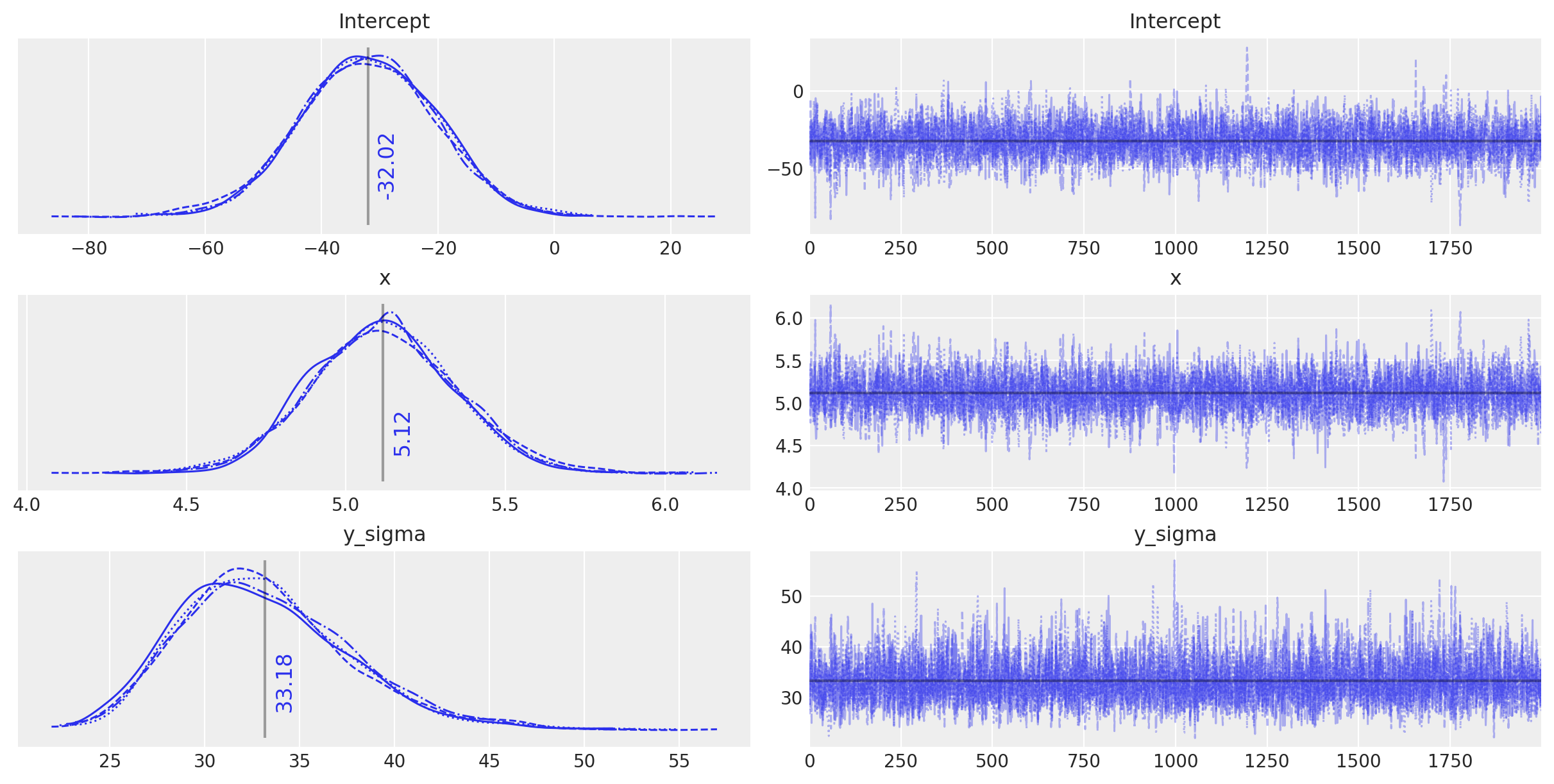 Leave-One-Out Cross-Validation or K-fold Cross-Validation is another quite universal approach for model selection. However, to implement K-fold cross-validation we need to partition the data repeatedly and fit the model on every partition. It can be very time consumming (computation time increase roughly as a factor of K). Here we are applying the numerical approach using the posterior trace as suggested in