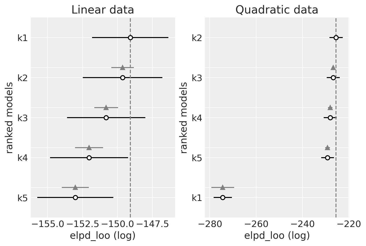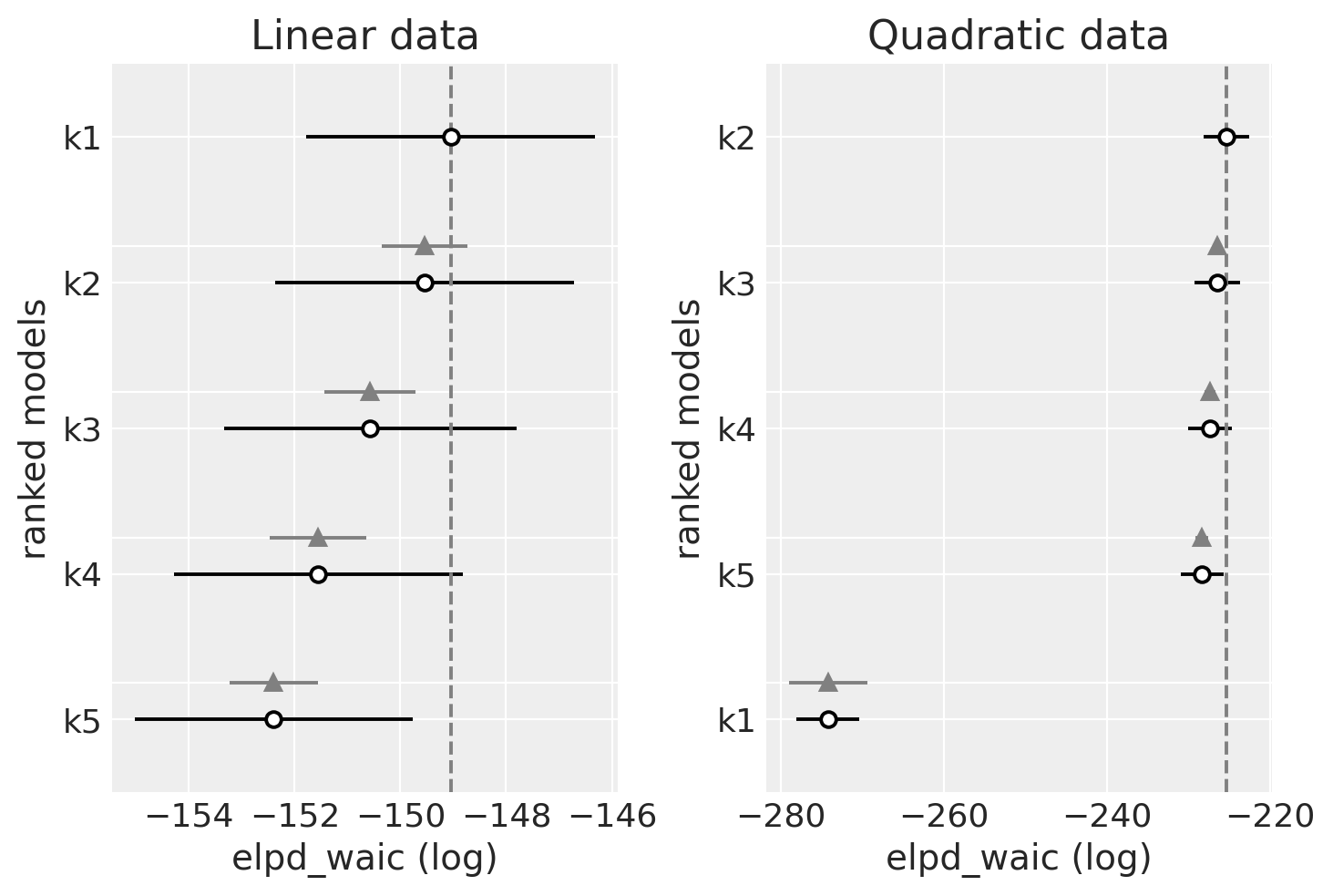 This example creates two toy datasets under linear and quadratic models, and then tests the fit of a range of polynomial linear models upon those datasets by using Widely Applicable Information Criterion (WAIC), and leave-one-out (LOO) cross-validation using Pareto-smoothed importance sampling (PSIS).