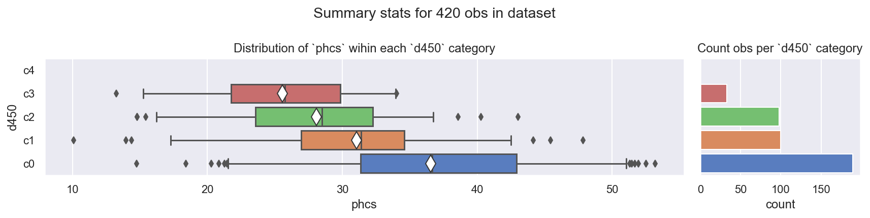 Quite interestingly, for feature d450, the highest ordinal level value 4 is not seen in the dataset, so we have a