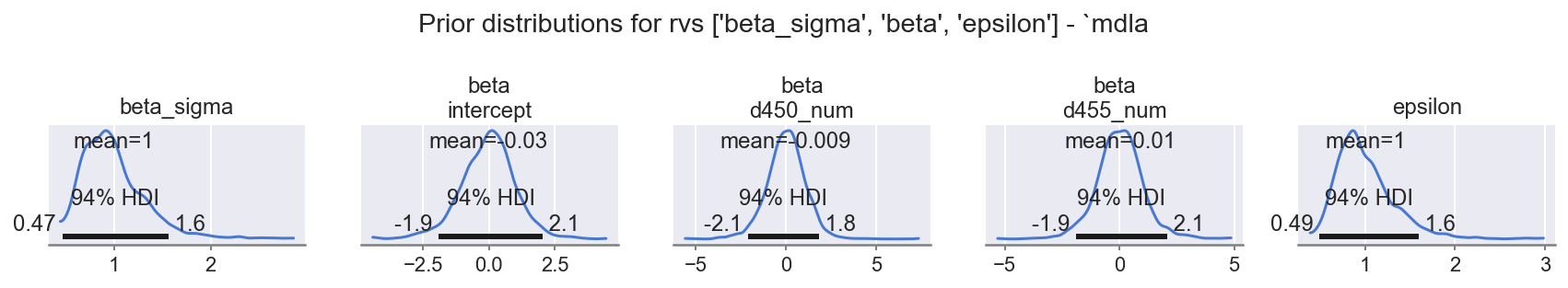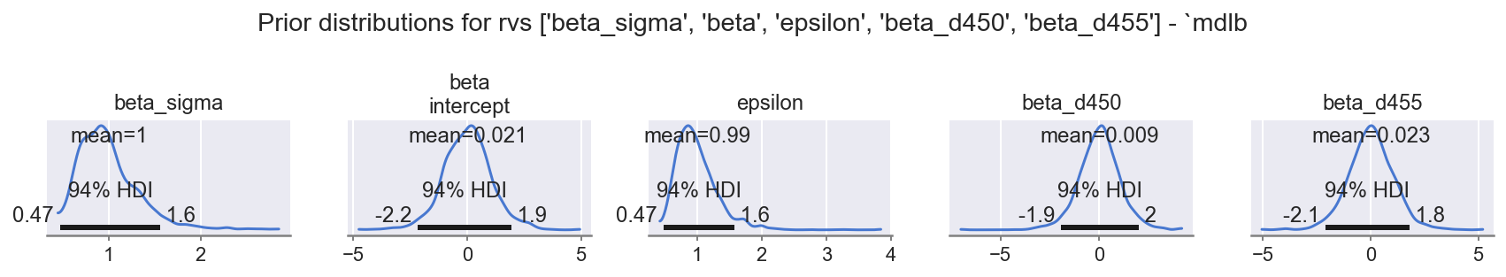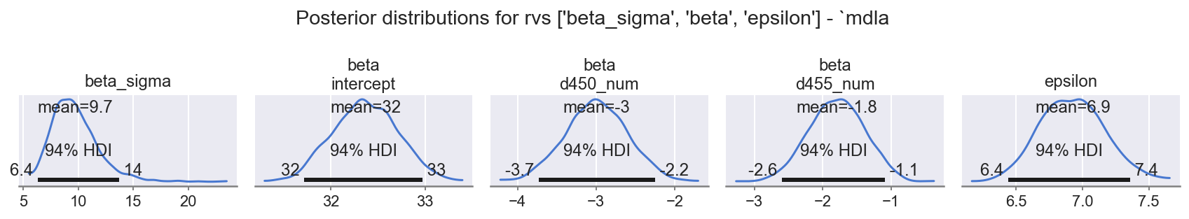 beta_sigma:E ~ 12indicates need for high variance in locations ofbetasbeta: intercept:E ~ 41confirms the bulk of the variance inbetas locations is simply due to the intercept offset required to get the zscored values into range ofphcs, no problemepsilon:E ~ 7indicates quite a lot of variance still in the data, not yet handled by a modelled featurebeta: d450:E ~ -12negative, HDI94 does not span 0, substantial effect, smooth central distribution:Higher indexes of