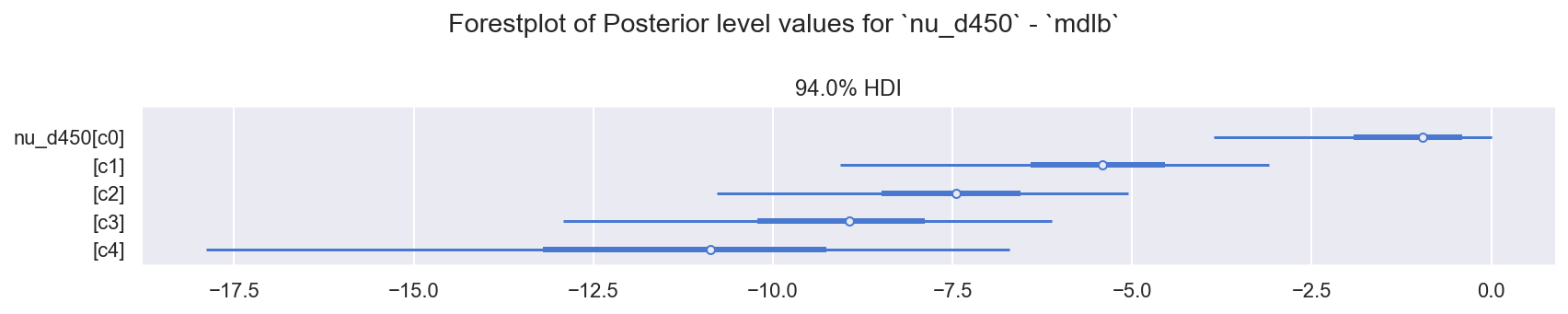 f = plot_posterior_forest(idb, "posterior", "nu_d450", "mdlb")