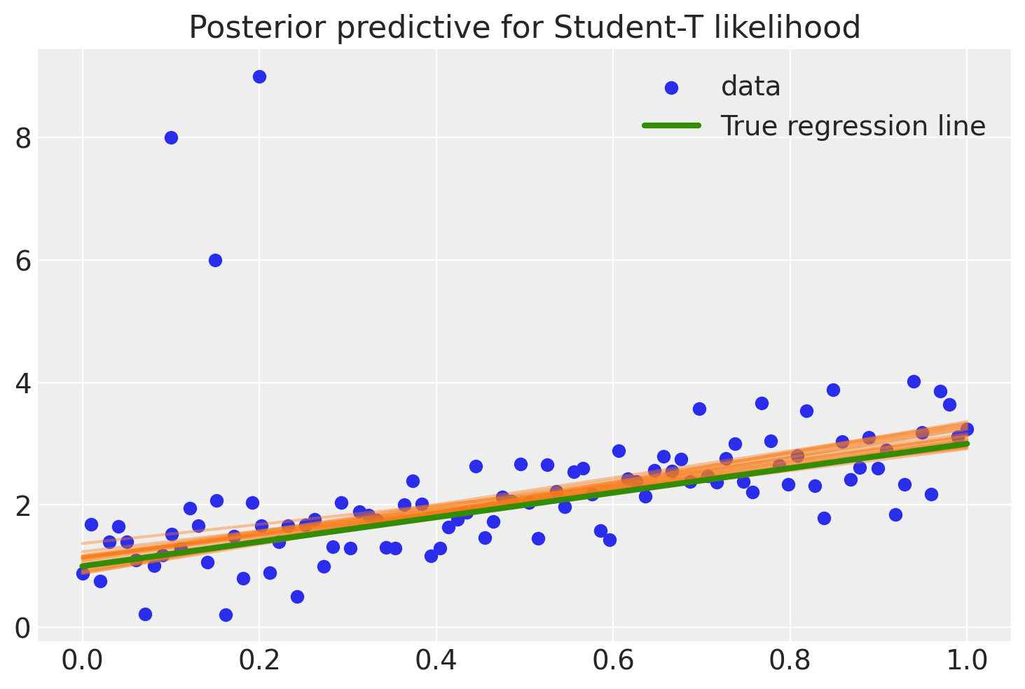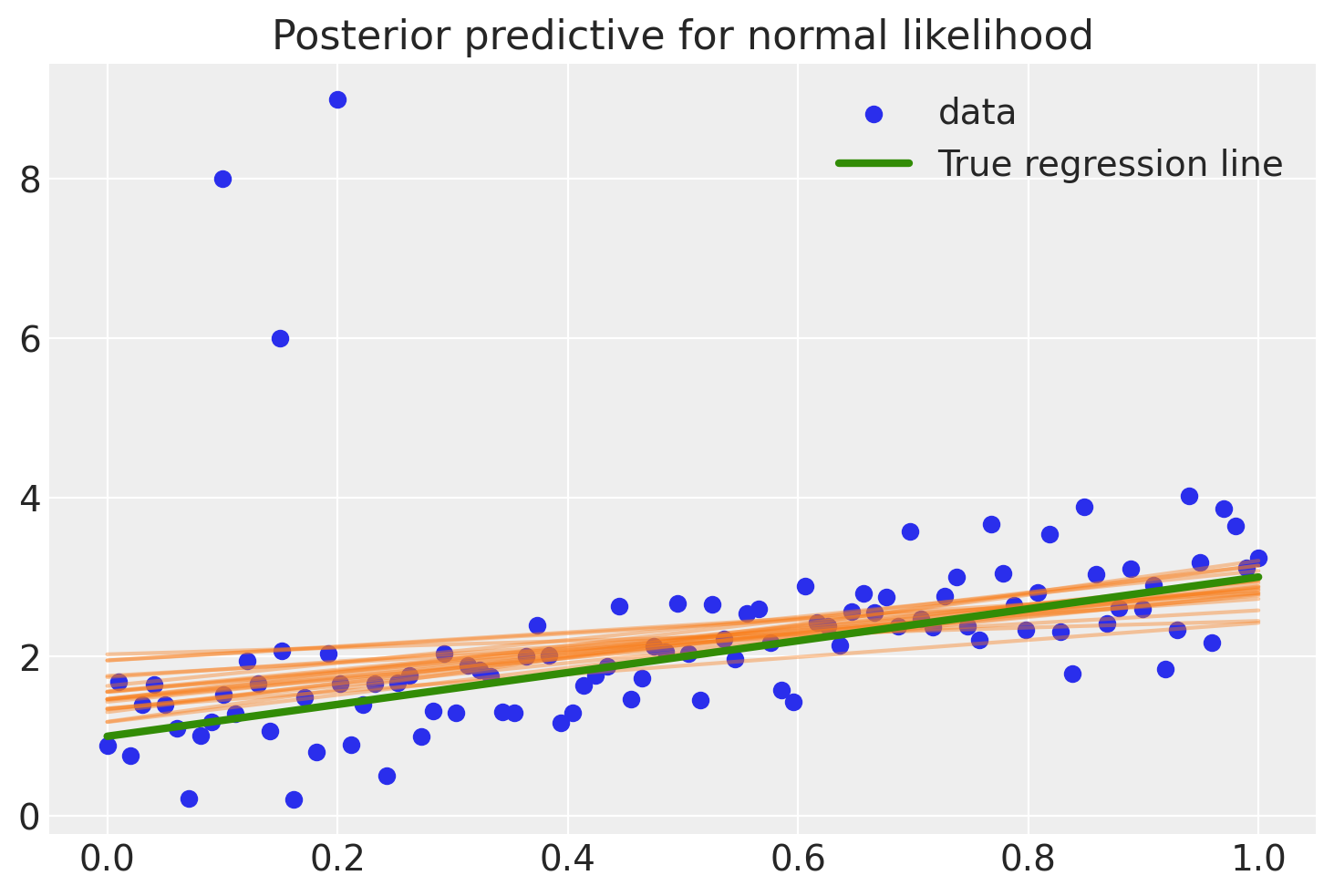 As you can see, the fit is quite skewed and we have a fair amount of uncertainty in our estimate as indicated by the wide range of different posterior predictive regression lines. Why is this? The reason is that the normal distribution does not have a lot of mass in the tails and consequently, an outlier will affect the fit strongly.