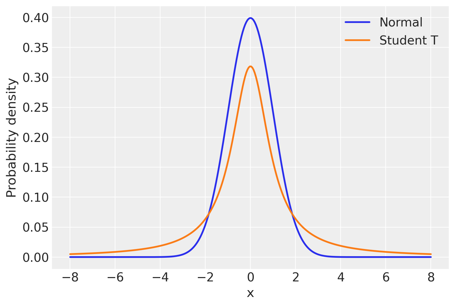 But what’s a Bayesian to do? Since the problem is the light tails of the Normal distribution we can instead assume that our data is not normally distributed but instead distributed according to the Student T distribution which has heavier tails as shown next [Kruschke, 2014, Gelman et al., 2013].