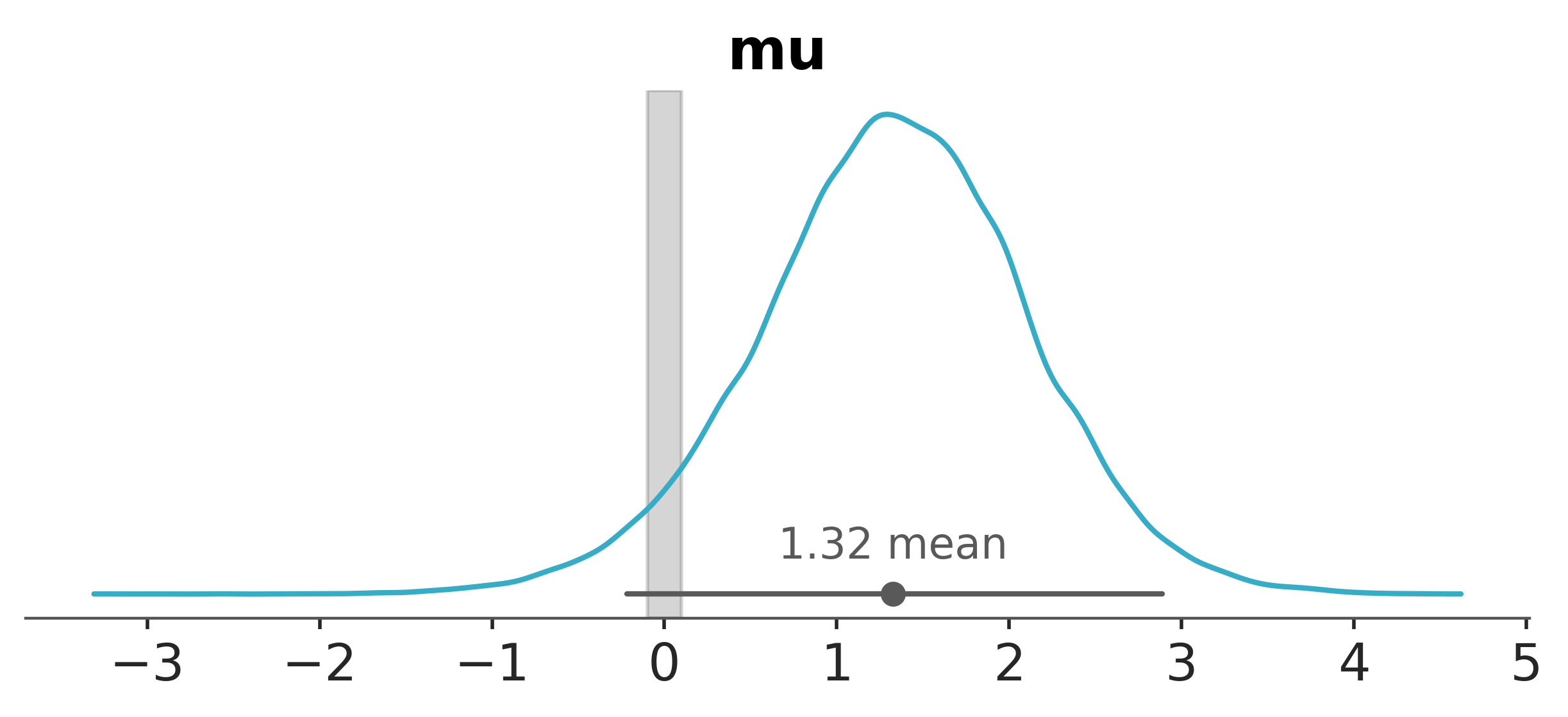The simplest form of hypothesis testing is to ask whether the mean is greater than zero. This is equivalent to asking whether the probability that \(\mu\) is greater than zero is greater than 0.5. We can compute this directly from the samples. So computing compute \(P(\mu>0 | x)\) is as simple as counting the number of samples where \(\mu>0\) and dividing by the total number of samples - equivalent to computing the mean of the samples where \(\mu>0\).