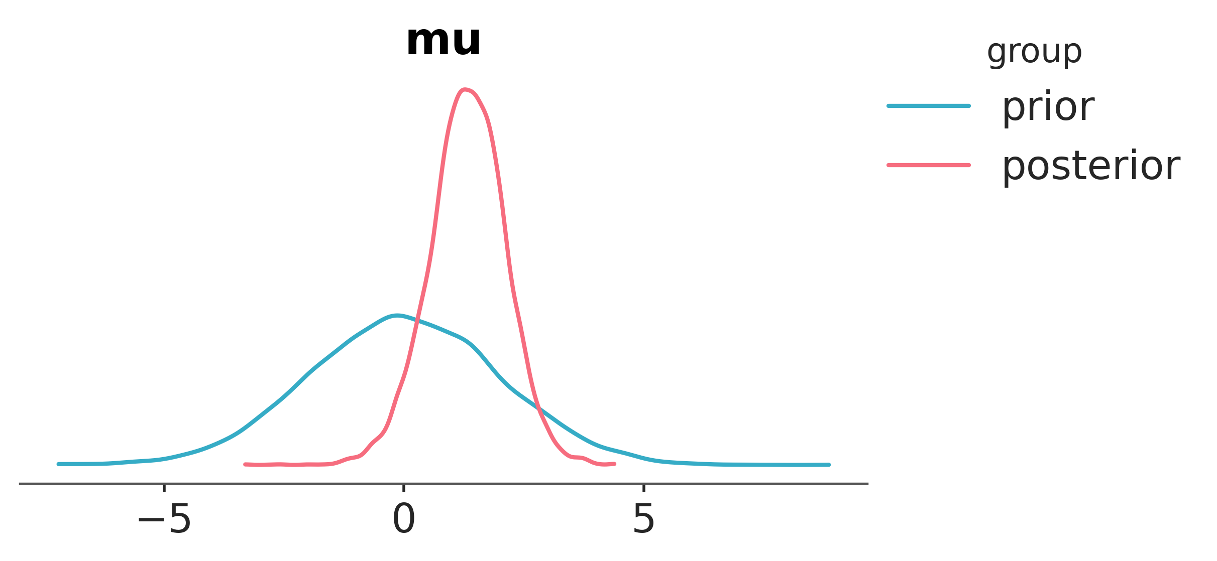 Finally, seeing as \(\mu\) is the core parameter of interest, we’ll visualise both the prior and posterior distributions for \(\mu\).