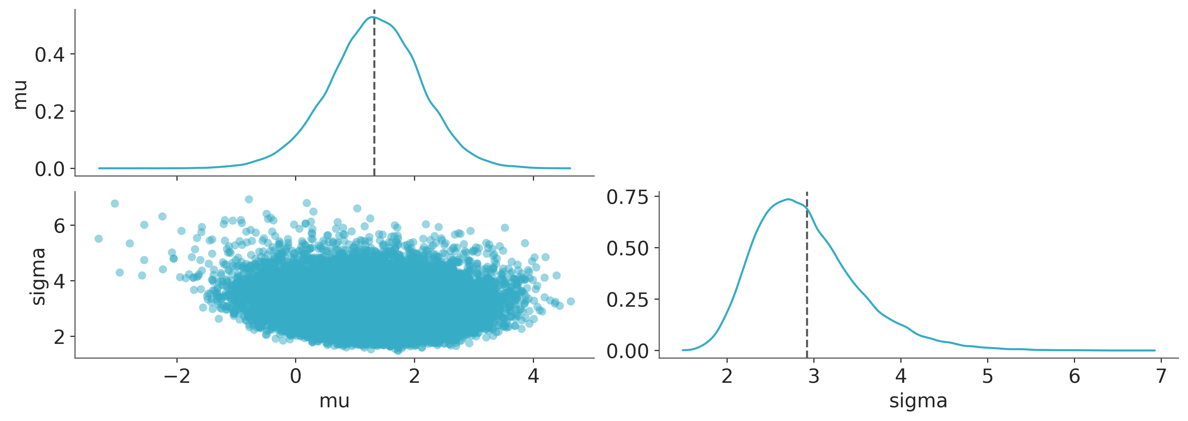 It is good practice to visualise the posterior distribution, so below we’ll look at the joint posterior over \(\mu\) and \(\sigma\) parameters. Everything looks fine here.