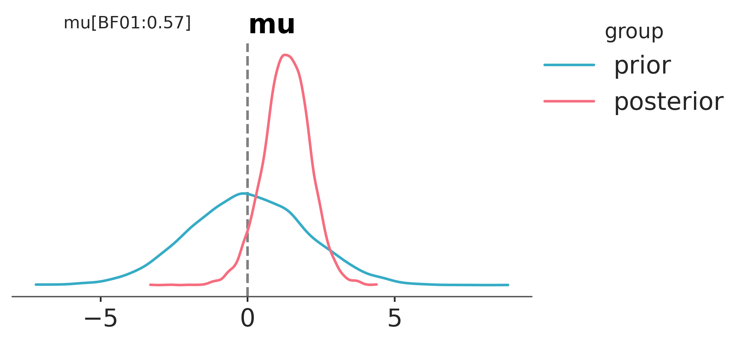 We can see that the probability of \(\mu=0\) has gone down after observing the data. This is reflected in the value of \(BF_{01}=0.54\) in that it is less than 1.